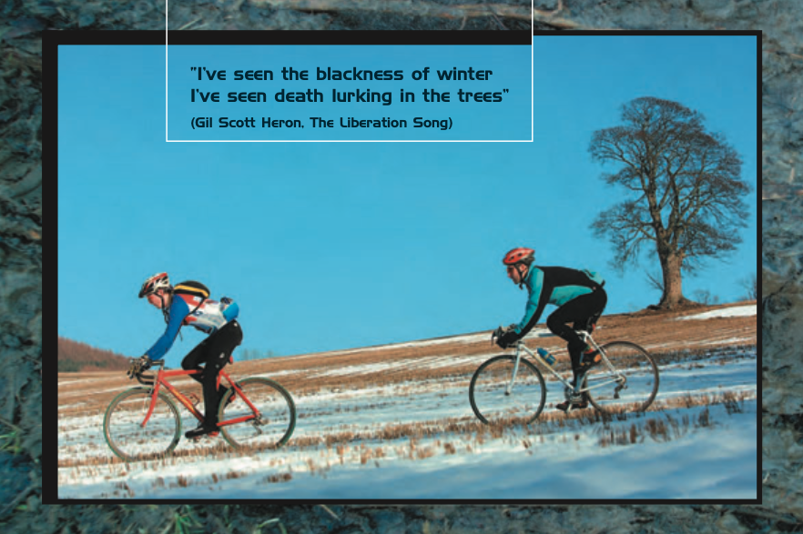 “Big fat fingers wrapped up in woollen gloves struggled to maintain a grip on the elegant curve of the brake levers. It only took the slightest slither of winter frosty dirt to turn them into the smoothest, silkiest, non finger-friendly devices known to man. Centre pull brakes howled and the skinny tubular tyres refused to lock onto anything solid. The leafy undergrowth mocked my flimsy treads as I hurtled towards the icy peril of the off-camber corner. Only my wits could save me now, with one foot released from my Alfredo Binda toe straps I used it like a counterbalance, trailing it through the frosty undergrowth and ‘swoosh’, I was through the apex with hardly any loss of velocity. My gods had shone on me for another day, I was addicted to this new sport.”