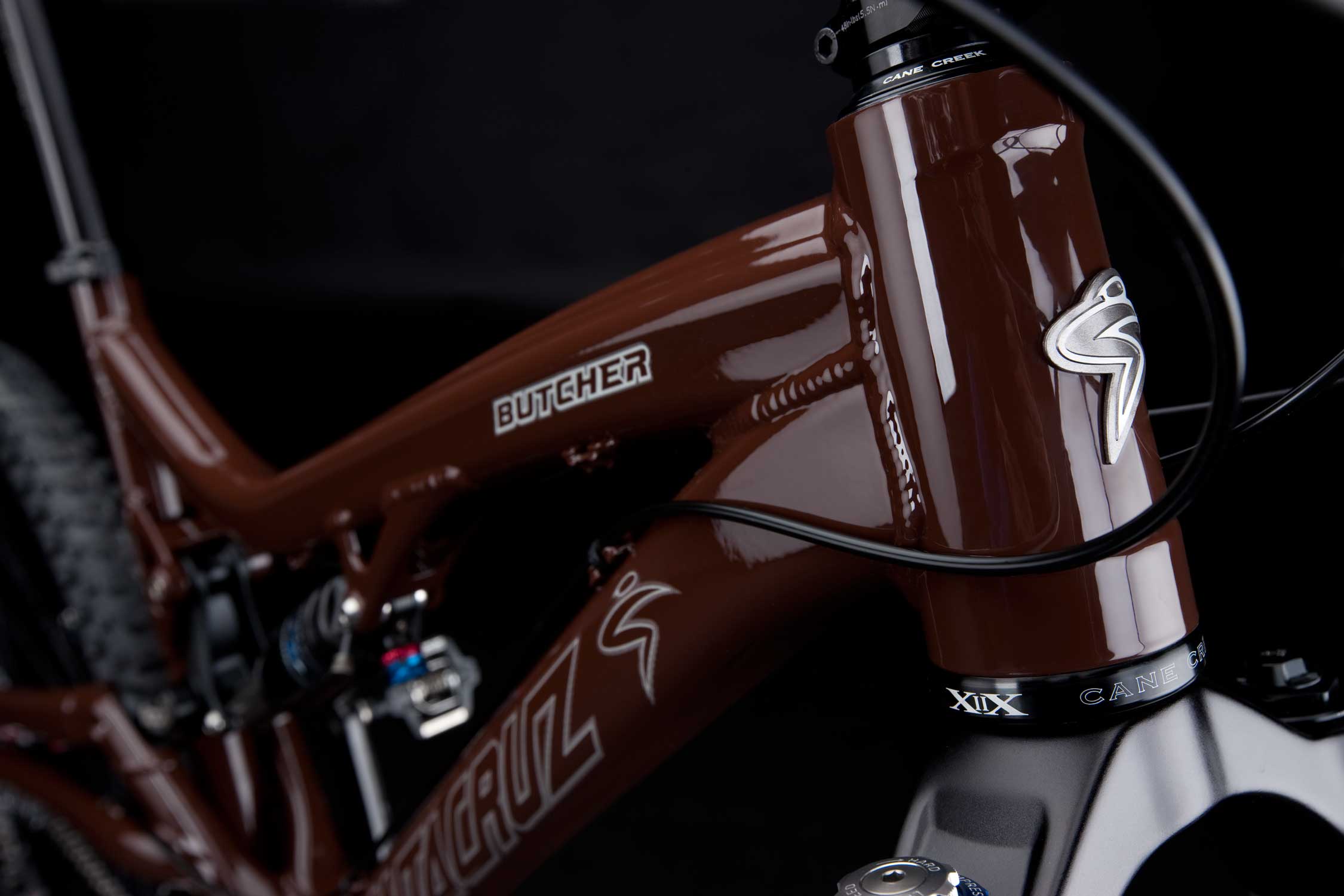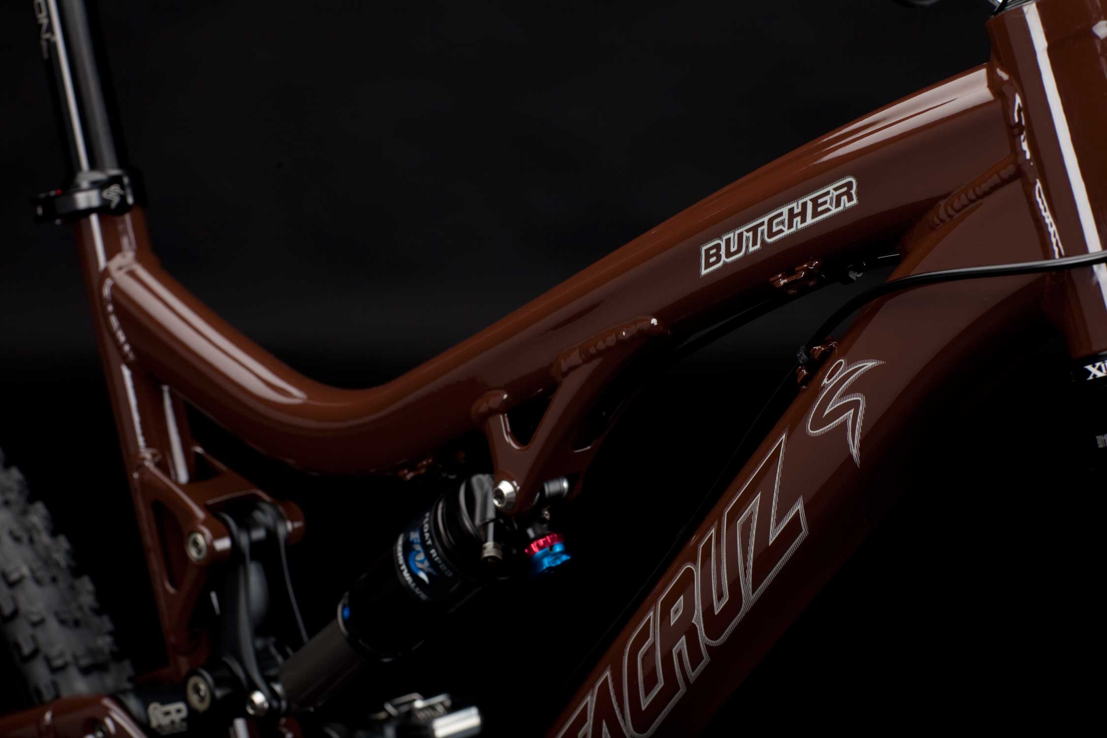 Here’s the new Santa Cruz Butcher. Nope, it’s not named after a purveyor of meat, nor Pat Butcher from Eastenders, but named for the famous (and fantastic) Butcher Ranch Trail in Downieville, California. It’s a trail that drops 5,000ft in 16 miles of singletrack. Along it are chunky rock gardens, some fantastic flat-out, loamy corners, boulders, trees, steep drops down to a river and it’s hard work all the way down (yes, we’ve been there and ridden it). The Butcher was designed to excel at this kind of terrain, yet still be responsive enough to handle the tech-y climbs (at 6000ft plus) and flat out rock gardens that are an inevitable part of monster downhills.