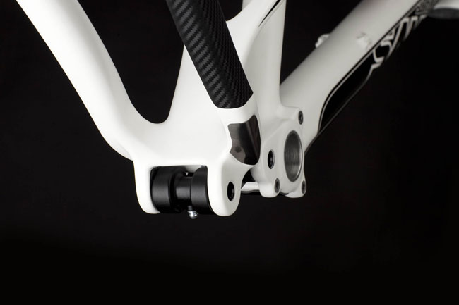 Alongside the carbon fiber makeover, the VPP suspension, and the trickest pivot hardware in the world, we added an impact absorbent protection strip underneath the downtube and along the drive side chainstay and seatstay. There’s a metal plate where the chainsuck gremlins usually strike. You’ll find cable stops for dropper seatposts integrated into the frame. An ISCG05 chainguide mount is molded into the bottom bracket area during lay-up, as are the disc brake tabs and dropouts. There’s a 1.5″ headtube up front, since we figured this bike would probably be getting treated with a bit more abuse than most taper-steerer forks would be intended to see. You can have it any color you want, so long as you like white with black decals or a matte carbon color with gold pinstripey decals.
