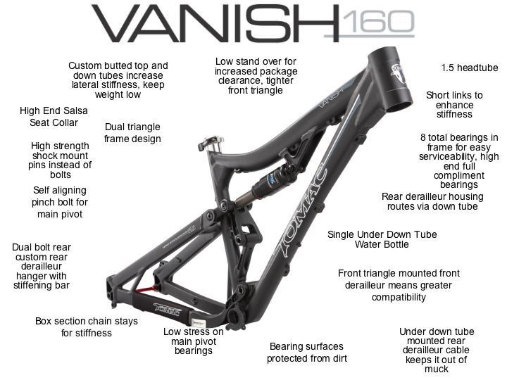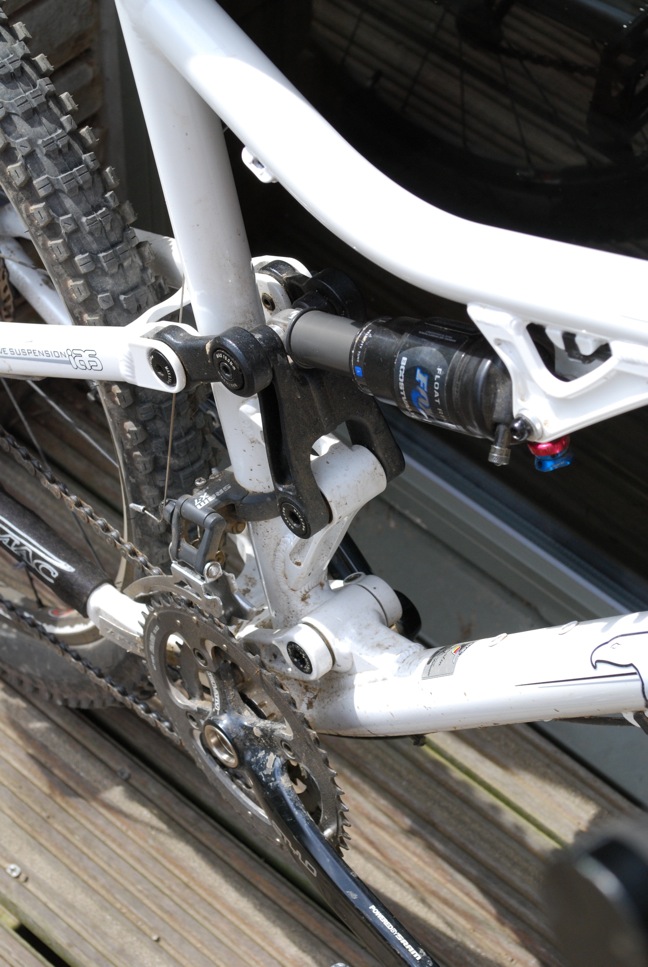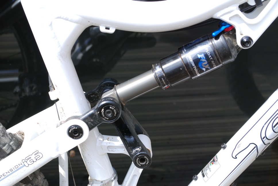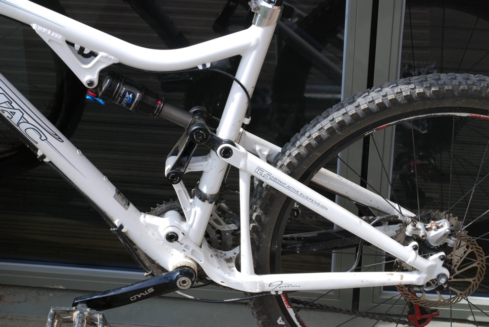 Tomac Bikes have a new suspension system for most of their 2010 range: Instant Active Suspension (IAS). The suspension is still a linkage driven single pivot but the swinglink has changed shape. Changing the shape of the swinglink has given the designers increased options on main pivot location (and thus axle path) and shock rates. Fundamentally this new swinglink softens the initial bit of travel. It’s also claimed to deal with bottoming out a bit better. Other side benefits of the new swinglink design is that it offers an interrupted seat tube so you can lower the saddle all the way if you wish.