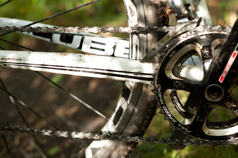 The frame is triple-butted aluminium, which in these carbon fibre times can seem a bit ‘last century’, but there are plenty of really nice details that let you know that someone has really sweated over the design of this frame. Things like the externally butted BB shell, the chain guard below the front mech, helicopter tape on the chain stays and downtube, the slightly flared hydroformed top tube to increase weld area at the top head tube, seamless welding on some tubes and a lustrous white paint job with tasteful graphics. The inclusion of bottle bosses will get some ‘cross purists tutting but it does make the bike a versatile beast that’s game for all day rides picking its way across OS maps.