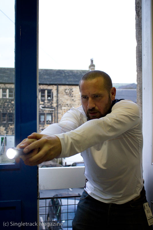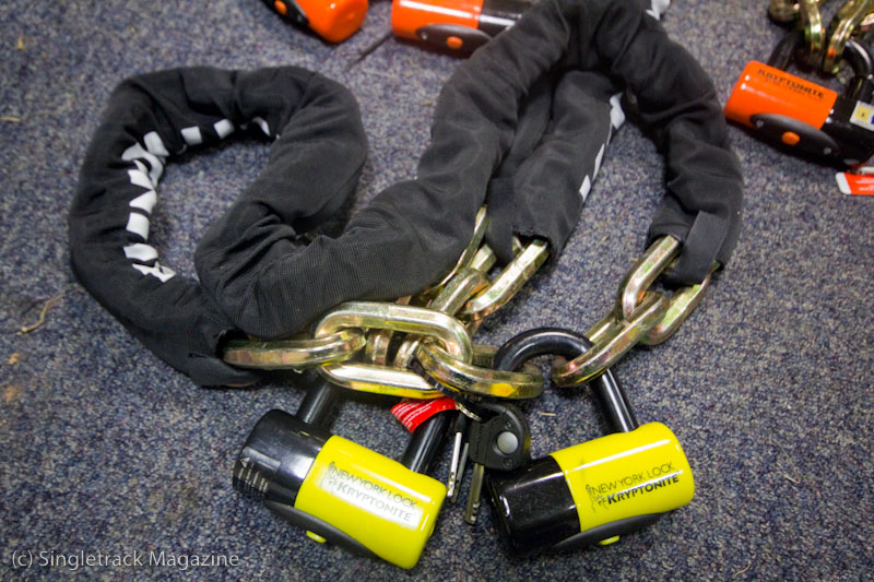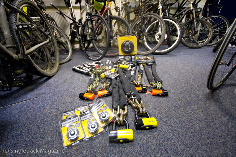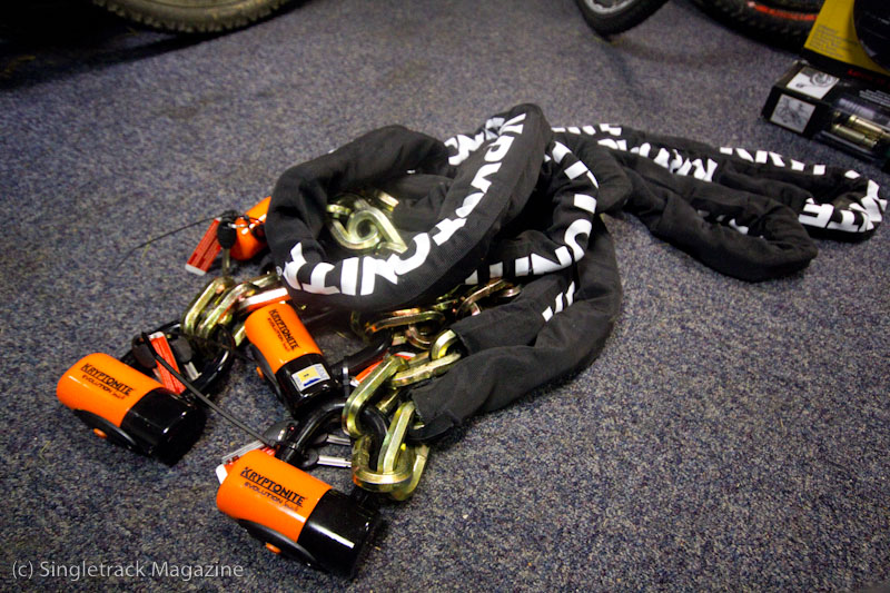 No, we’re not working on a Houdini-style routine and Chipps isn’t going to be hanging from a box over the Rochdale Canal looking all mysterious with drawings on his hand; the lovely people at Kryptonite have send us enough locks and chains to secure the many bikes that live in our office.