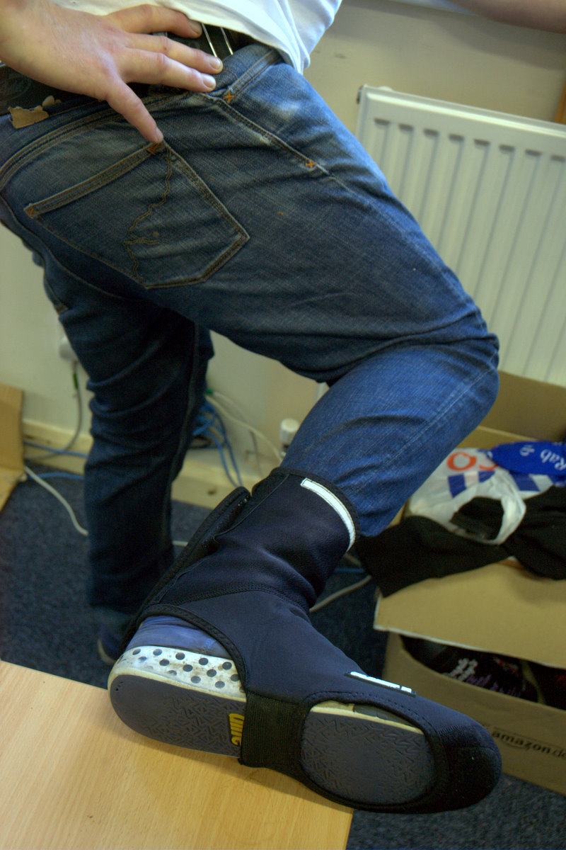 Bargaintastic warm things from Doncaster for our Matthew, who still insists that he’s not a roadie really (but doesn’t it go fast when you pedal it hard…?!). Neoprene overshoes: