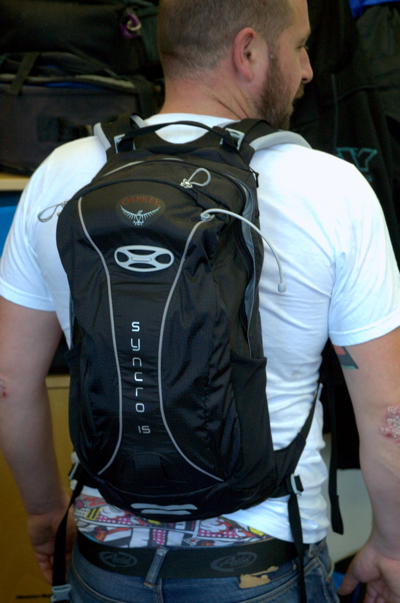 New daypack from Osprey. It’s a curious mix of bike-specific hydration pack vs. faux-rugged man sac: LidLock helmet carrier/semi-rigid airy back system/lightweight perforated harness/rain cover vs. removable waist belt/massive organiser pocket/reflective bits & light loop/subtle urban-friendly black. We like.