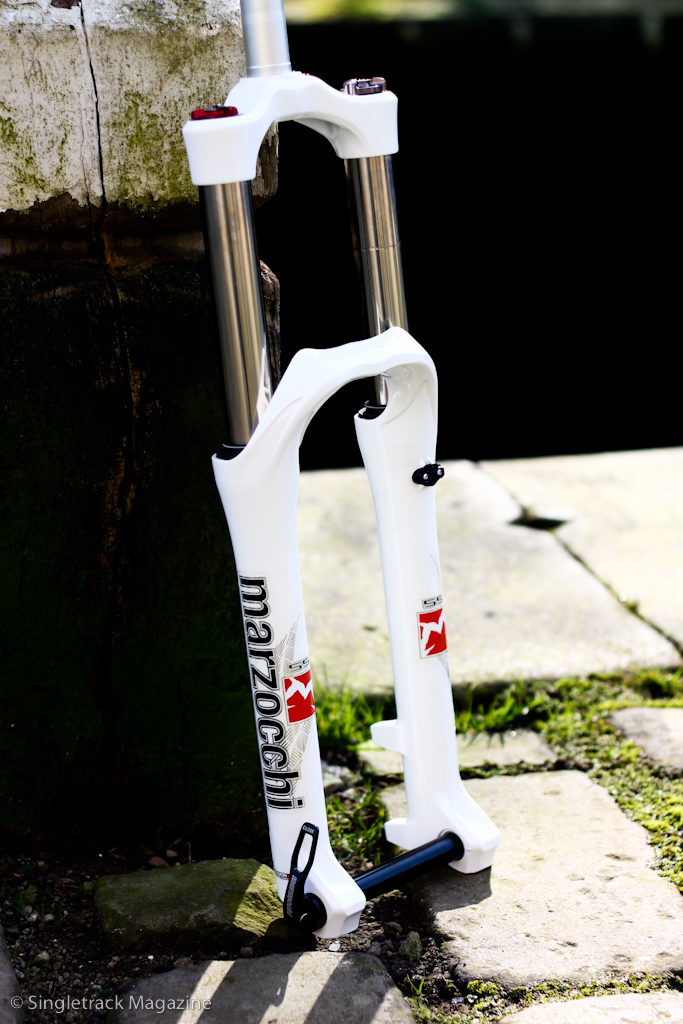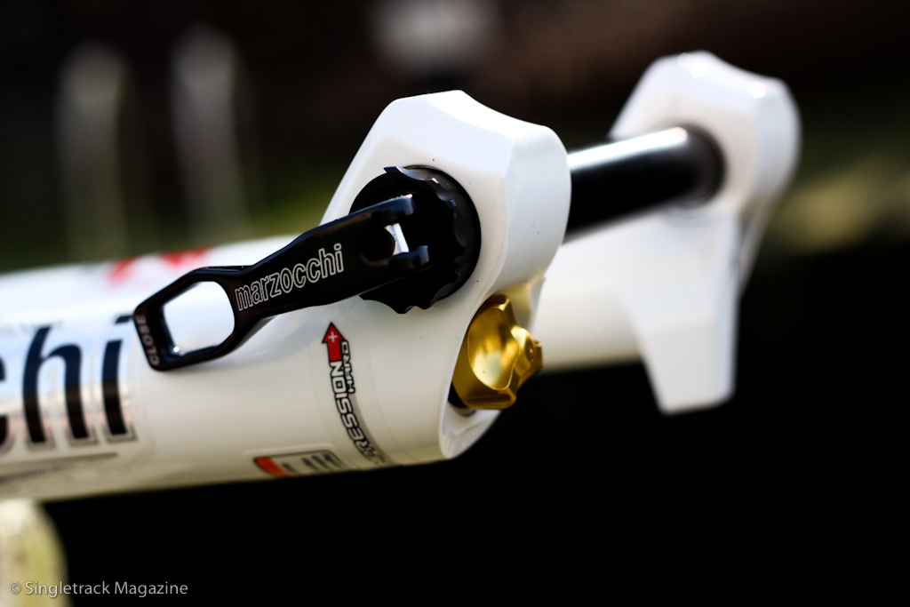 The external compression adjuster lives on the bottom of the leg with rebound, mechanical and air preload up on the tops. There’s a QR 20mm thru axle and you can get them in a tapered steerer version too. We’re looking forward to getting out on them seeing if the Marzocchi reputation of old is set to return…