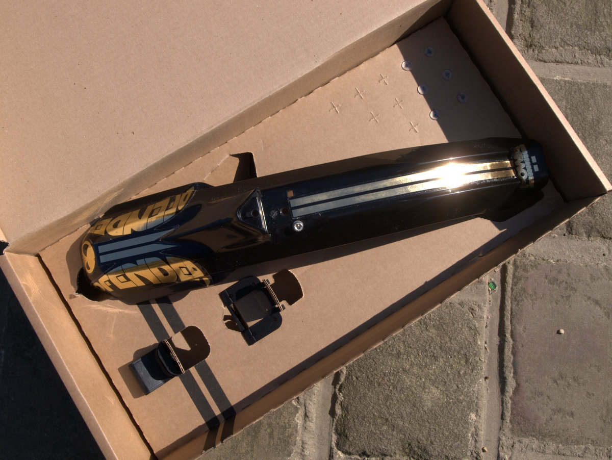 Hot on the heels of the front page news story furore, here’s one of ‘those’ DFender mudguards fresh from the brain of Chris Porter and pals. We’ll refrain from further comment until we’ve got it on a bike and it’s started raining again, as the proof of the product is in the riding, but it does score 10 out of 10 for presentation. We like a neatly folded box.