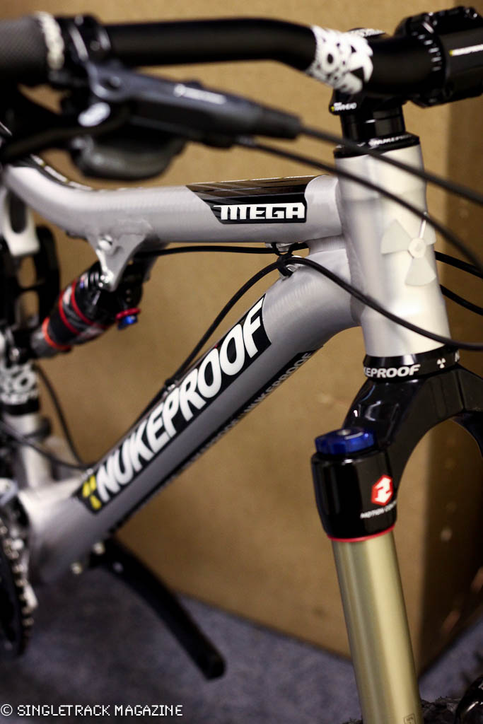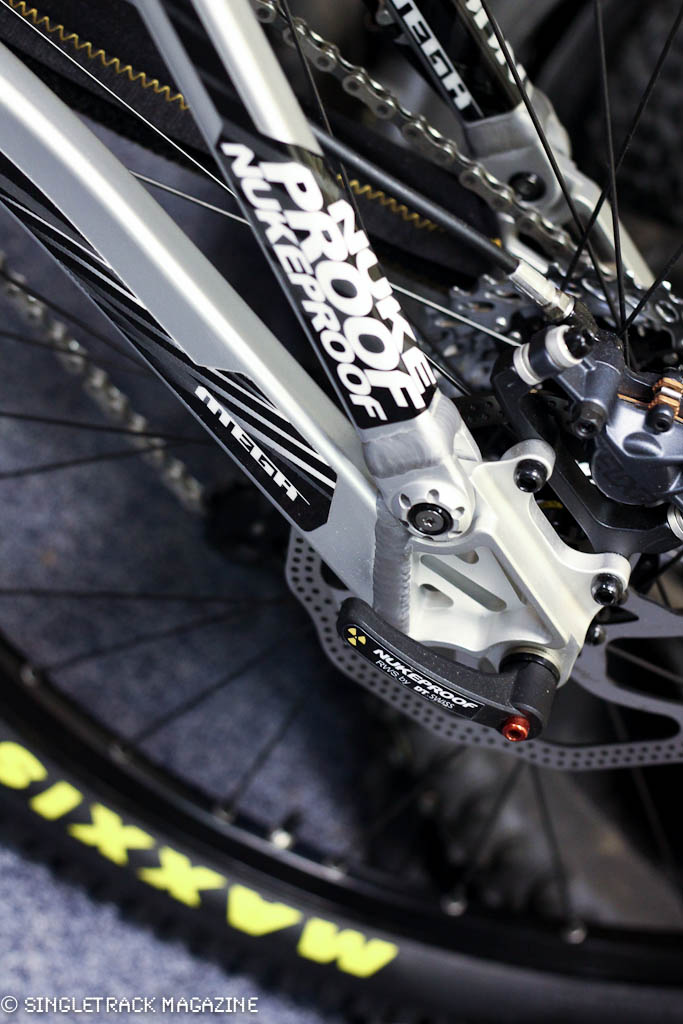 The eagle eyed may notice that’s a 104BCD chainset with a proper double and bash setup to go with the chain guide. It gives a fairly clear idea of what they reckon you should be doing with the Mega. The one piece BB and lower pivot section should help keep everything in line too, while the back end uses a 135x12mm through axle and DT-alike lever.