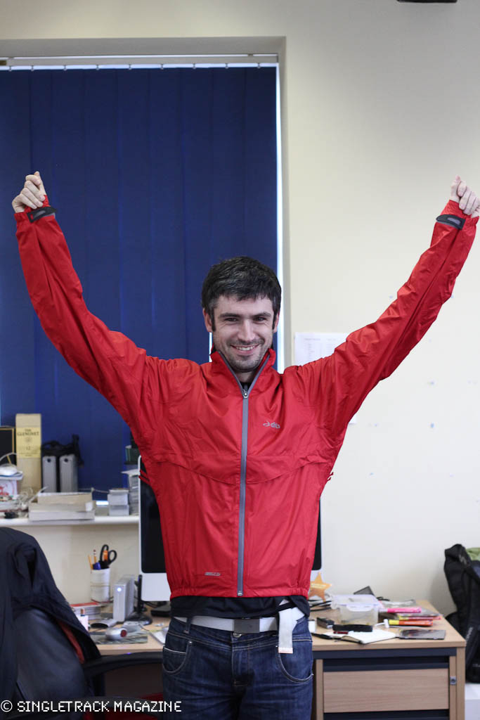 Made from waterproof and polyester ripstop Pongee (that’s fine woven cloth, originally silk) treated with Teflon, this 2.5 layer jacket has a mesh liner to keep fabric off clammy skin. It’s got fully taped seams, adjustable cuffs and a pair of zipped chest pockets. The cut is described as ‘medium-fitted’ and has a long, elasticated tail to cover your bum.
