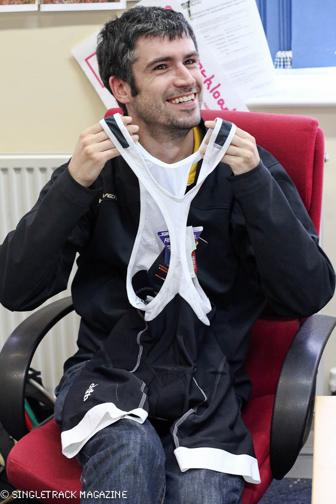 These are the feminine form friendly Aeron Pro shorts, which are dhb’s top end ladies bibs. They’re made from moisture managing ‘Field Sensor’ fabric with carbon fibre mesh reinforcement on the braces and there’s a dual density 3D ‘Tour Air’ chamois. The multiple panels are designed to give a compression fit, which dhb say helps keep your core stable and improve blood flow. Sadly, Jenn took them away from Sim, so we’ll never know how he’ll look in them.
