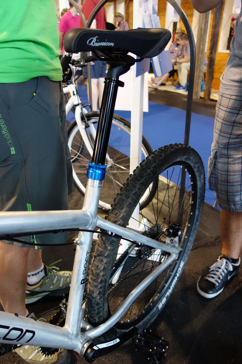 The first is a truly integrated dropper post. Instead of the dropper seatpost going in the seat tube, the seat tube is actually used as the outer of the dropper post. Obviously you’ll need a special frame, but it’s the kind of thing that might appear in some Bionicons in the future and that they might license out to other companies.