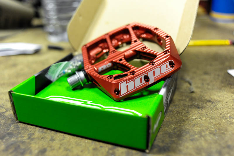 They’ve been a long time coming but at last they are here, the Hope F20 pedals. 20 replaceable pins per pedal along with cartridge bearings and a cromoly steel axle mean they are tough enough to last and easy enough to rebuild. As with everything Hope theres every colour of the anodised rainbow as long as your rainbow only has black, silver, red, blue, gold and gunsmoke.
