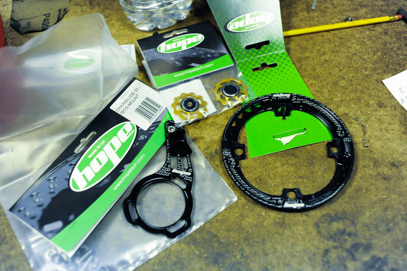 If you had a warehouse full of machines what would you make? We’d be tempted to go all Tony Stark and build ourselves an anodised exoskeleton and go fight bike thieves on the mean streets of Calderdale, or throw ourselves out of a balloon for a laugh. Hope have probably already done both those things, got bored and decided to just make bike bits instead. Their latest CNC’d widget-bobs to land here at t’office include a natty chainguide and intergrated ring/bashring combo and some blingin’ jockey wheels. These are probably going on Chipps’ CX bike for his forthcoming IRN BRU ‘cross Rampage throw down contest. Watch out for some massive dismounts. Epic.