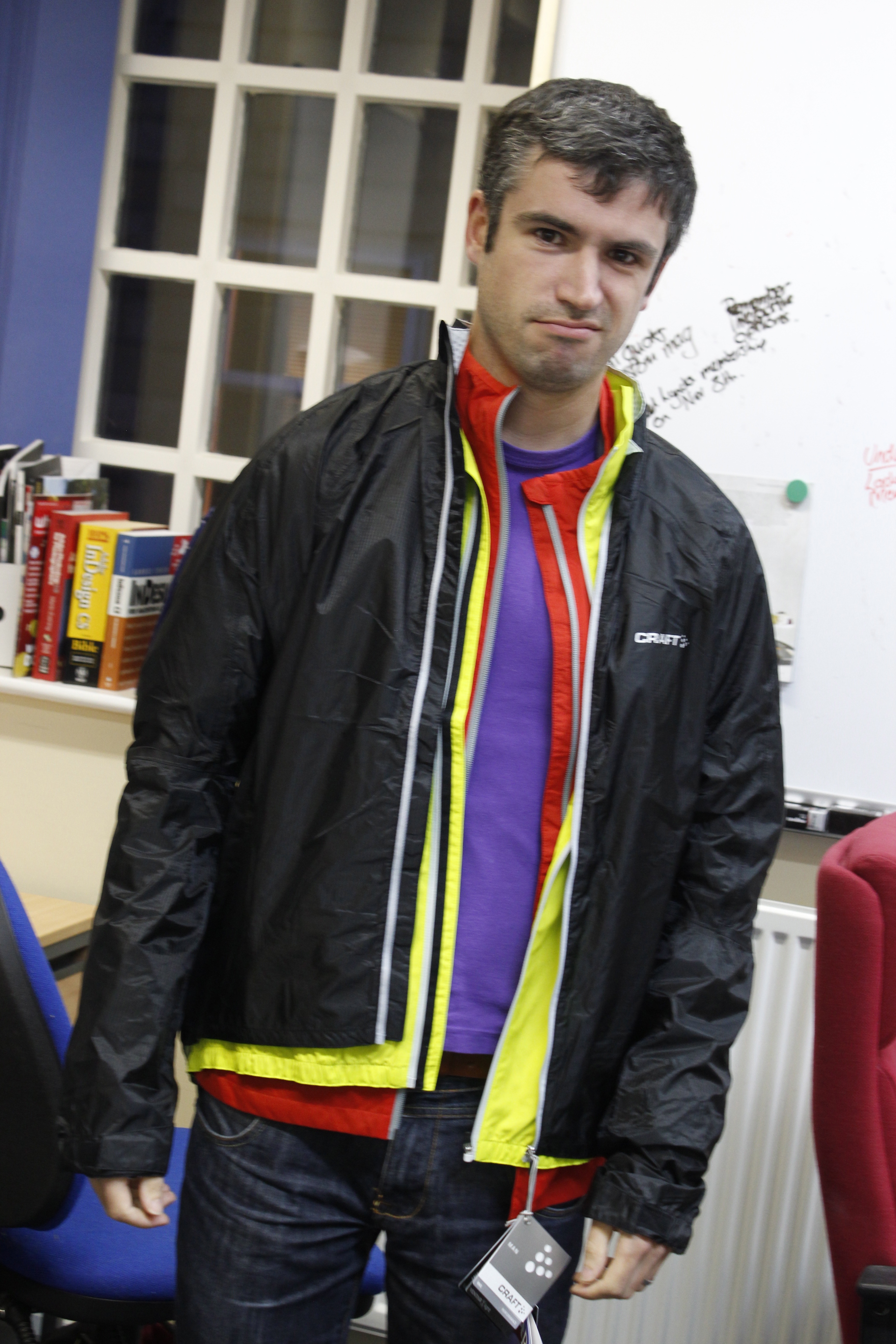 The next layer in the pass-the-parcel is Craft’s ‘proper’ waterproof shell. Lightweight, waterproof and breathable with a slimmer, ‘performance’ cut, it’s exactly what we’d look for in a pocketable outer layer. Sim is only making a face because it’s black, which offends his designer’s ‘any colour as long as it’s neon’ sensibilities.