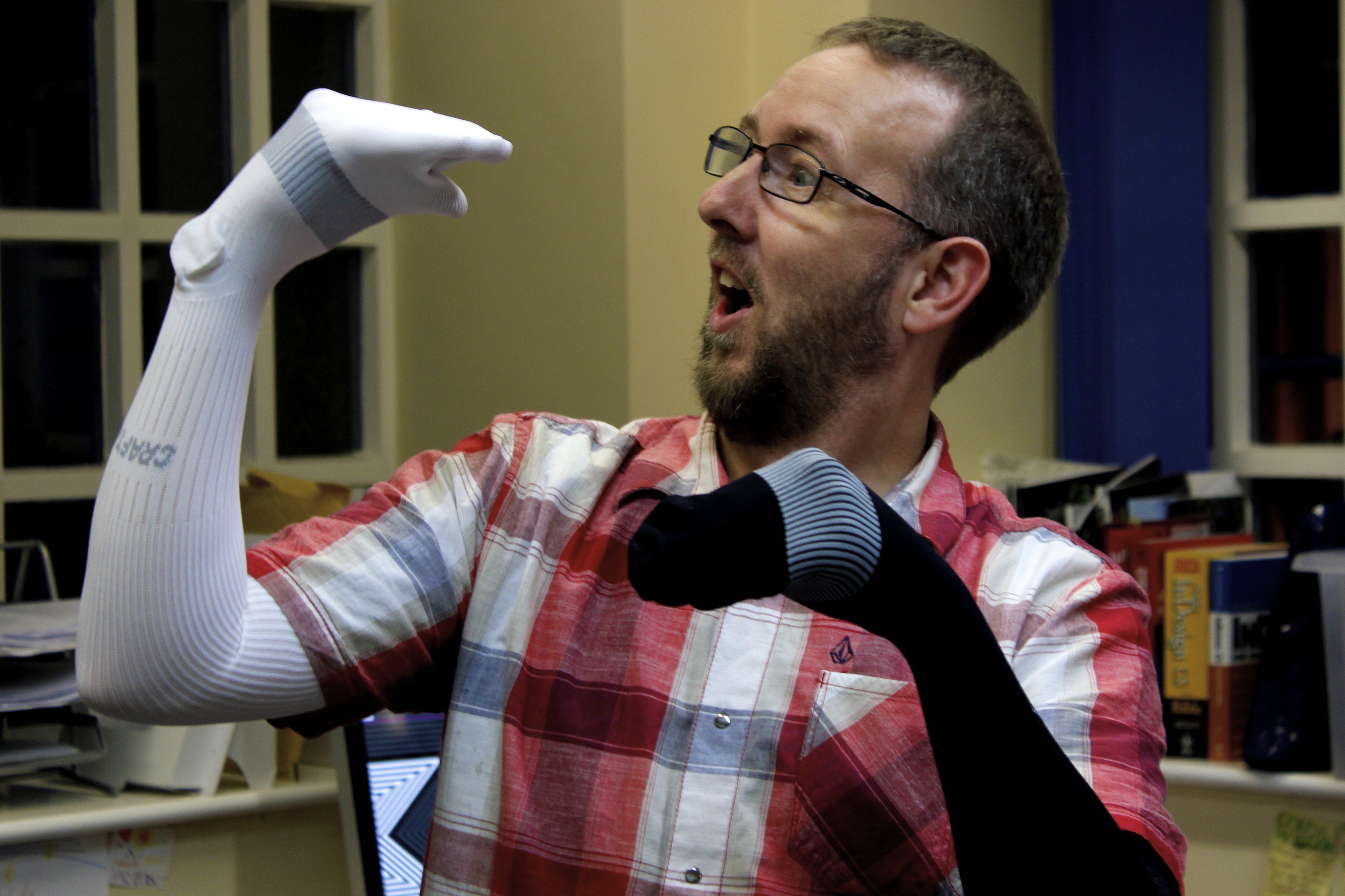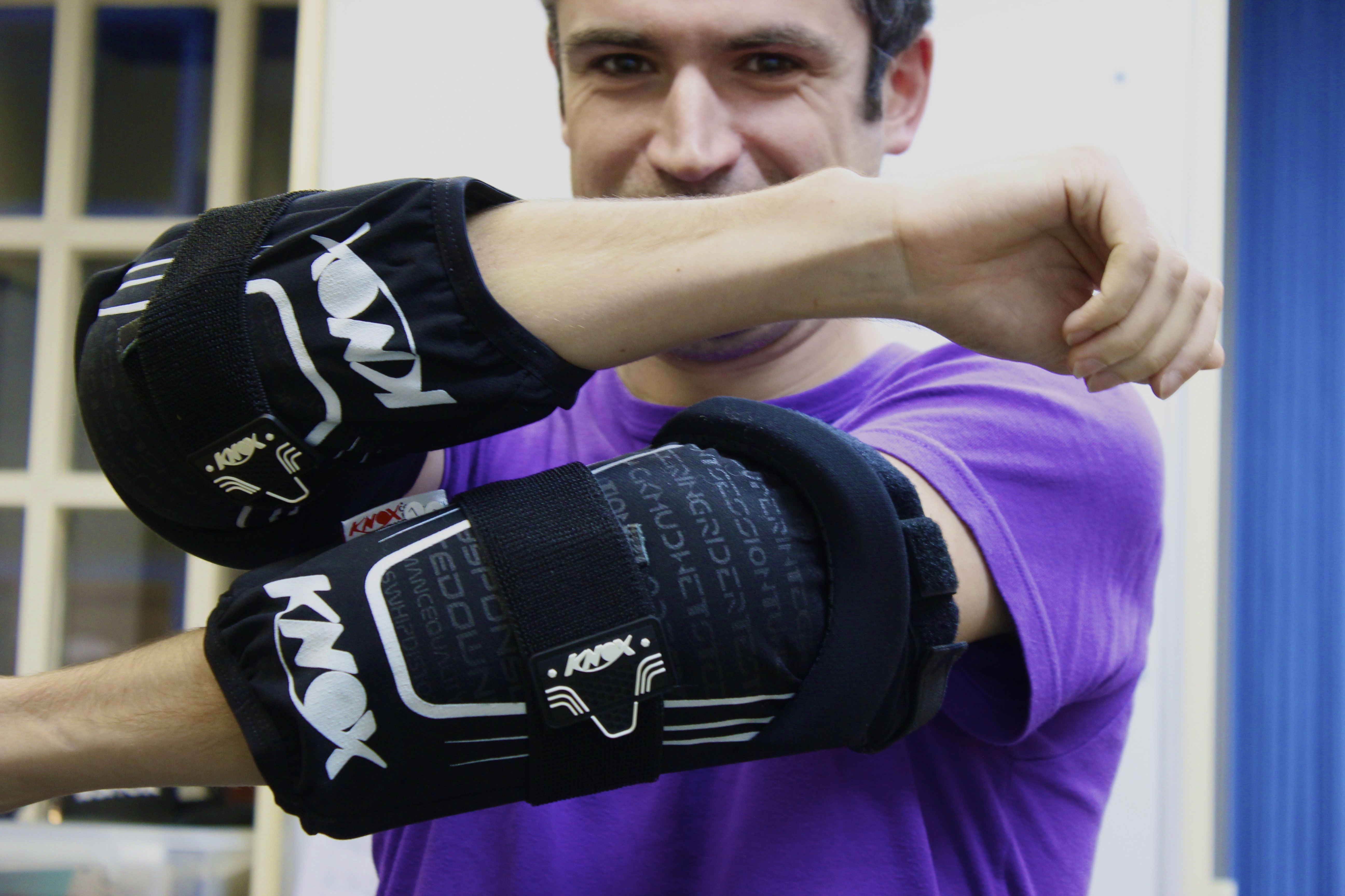 These are the knee version of Knox’s ‘Flexiform’ pads – so called because they have a high level of elasticity while maintaining a high level of protection. Or summat. Also available for elbows. Nobody needs to see Sim’s chimpazoid shins this late in the day though so we’ve spared you the trauma by making him use his arms to model.
