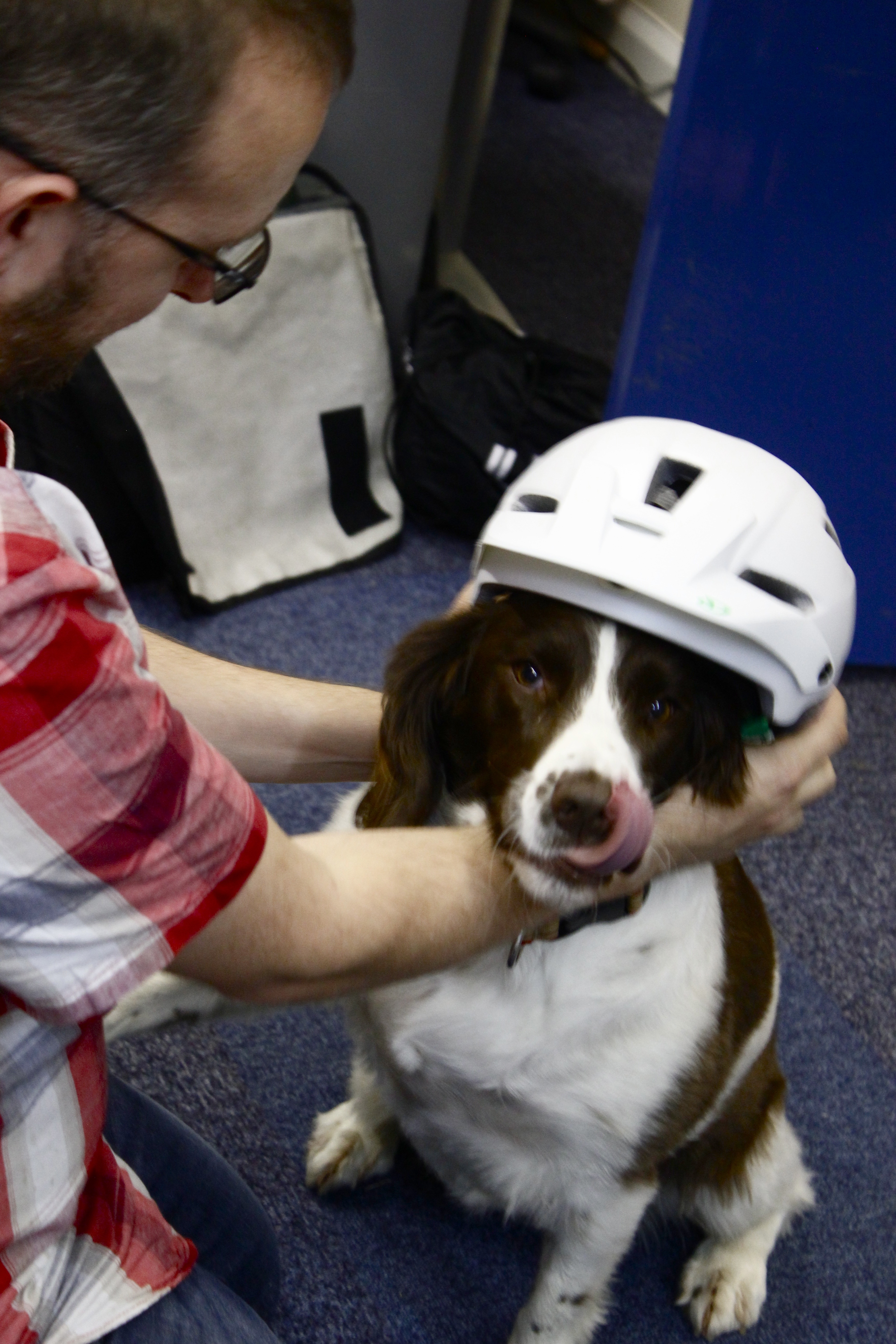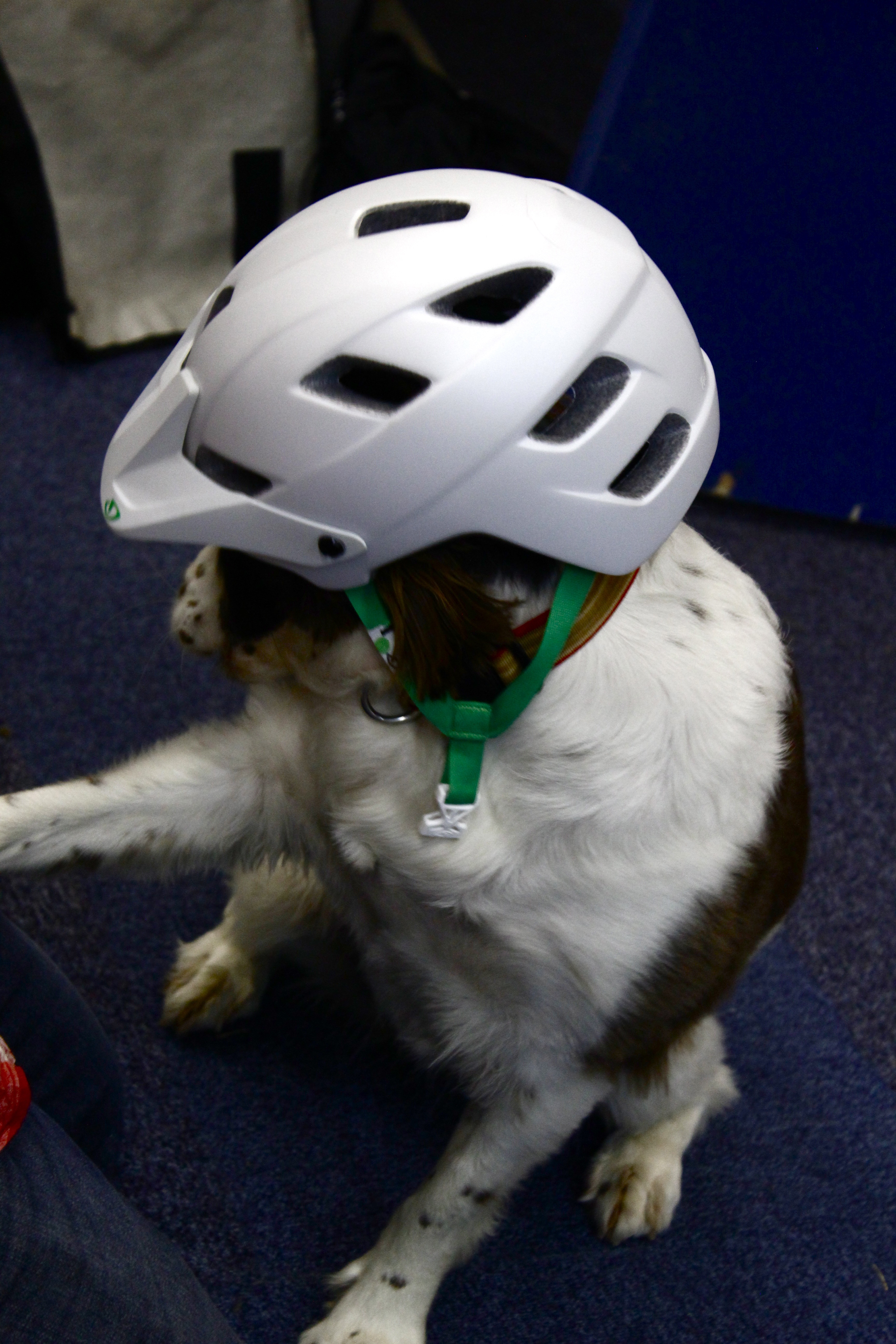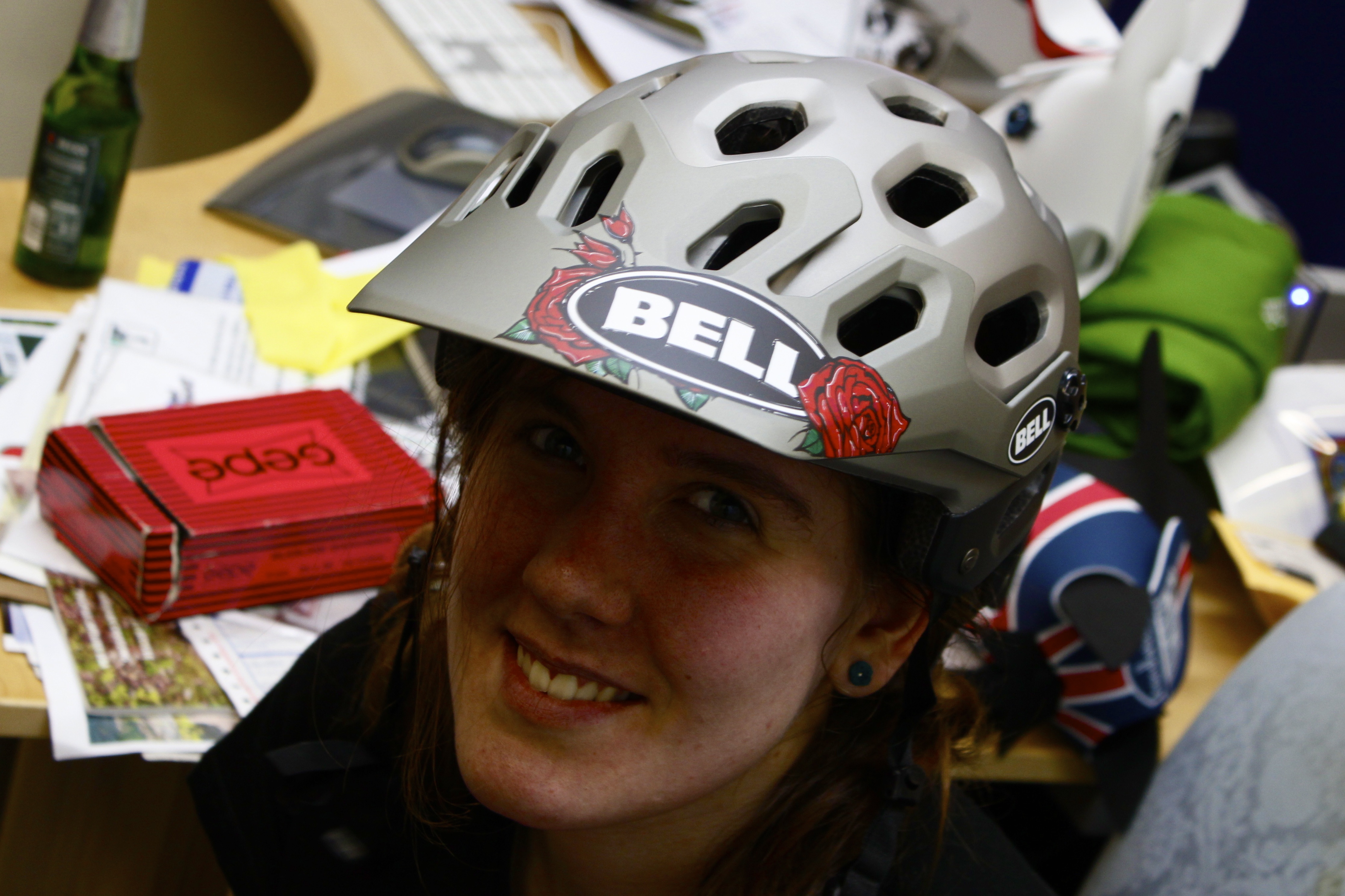 When all fails, get the dog to model the helmets. Dolly is (not) wearing Giro’s new Feather helmet – it’s the more feminine take on the Feature trail lid, this time in a size small so pin-head folk (like Jenn) don’t feel left out in this world of medium-sized samples. (Our heart bleeds.) Thanks Madison!