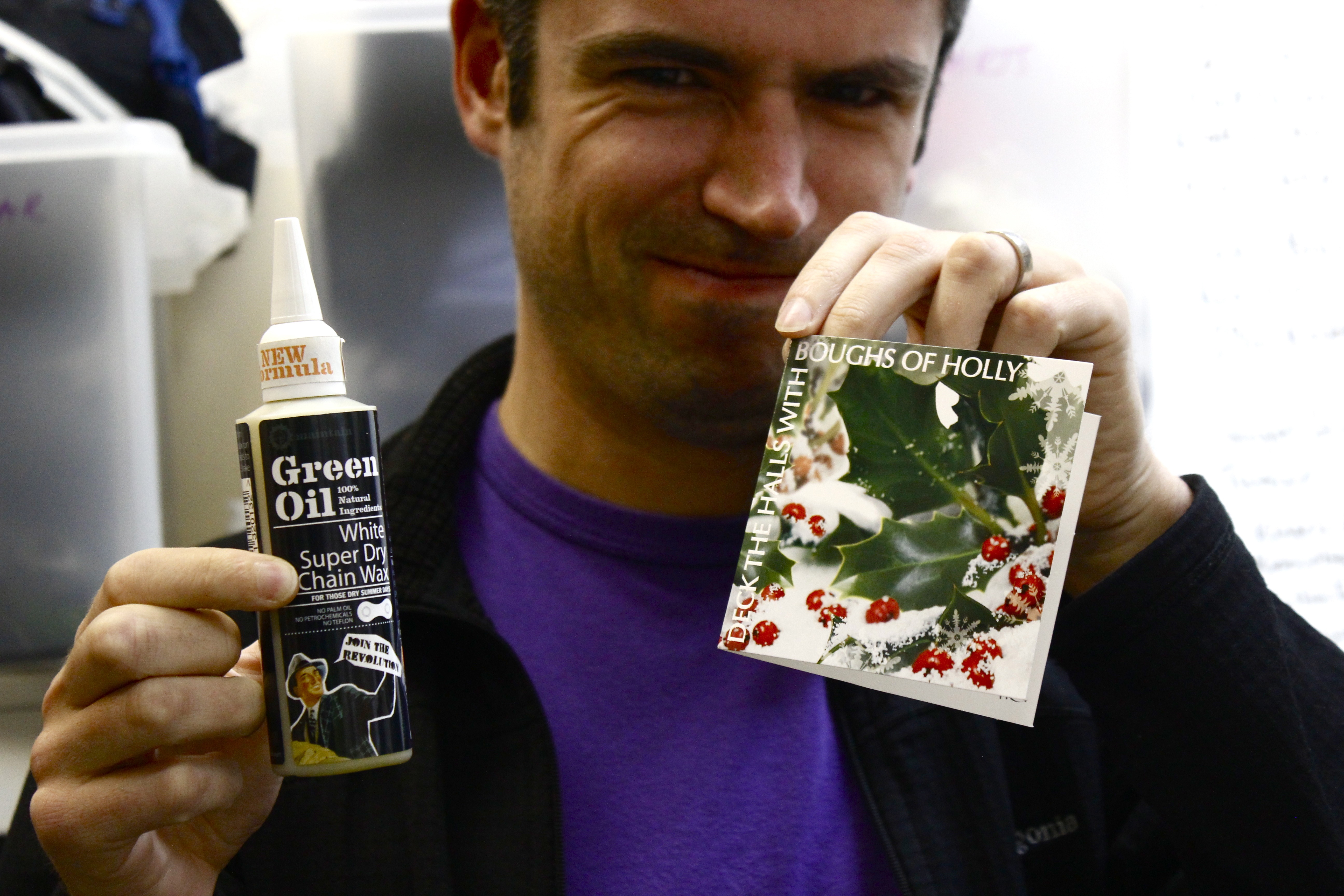 …as Sim’s grumpy face indicates. Sim also has his grumpy face on because Green Oil’s parcel arrived in the same post as Singletrack’s first Christmas card of 2012. Thanks to Keith from Max Bikes PR for reminding us there are only 52 shopping days left til Christmas!