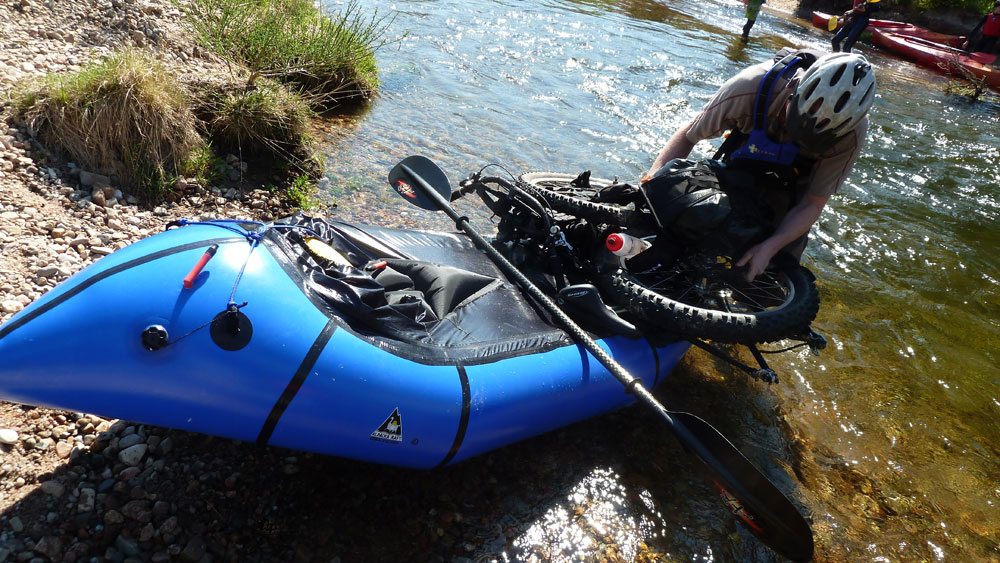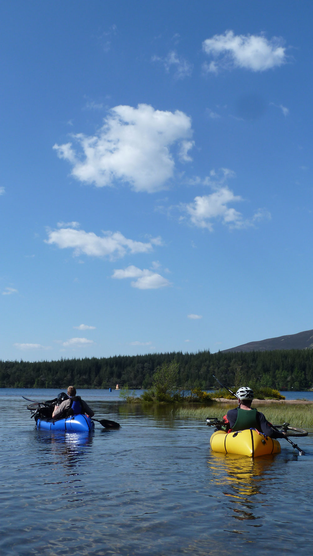 Eager to get started, we suited up with our life jackets and were up and paddling. With Loch Morlich flat calm, we got to grip with the rafts. Despite their small size and light weight, on the water they felt remarkably secure while able to be turned on a sixpence. Immediately, my concerns about bad things happening on water evaporated. This was going to be fun. Trying to get to grips with paddling technique, Colin led the way with his considerable experience garnered from years of kayaking while the rest of us honed our own techniques that would work best for each of us. Looking around, everyone was grinning and enjoying themselves. This was fun! After much fannying around and good natured piss taking in the way that men seem to thrive on, we put in for shore for the next stage in our Mr Miyagi style induction into the mysterious ways of the Bike rafter. Conscious that I was in someone else’s boat that cost the thick end of a grand and was made of a material that appeared to worthy of the moniker “paper thin”, I was intrigued to see how we could mate up our jaggedy, pointy bikes with pack raft. On cue, Rob and Andy pulled out their custom heavy duty tarp sheets that they had made for such occasions and demonstrated how to attach them and ultimately our part dismantled bikes onto the fronts of the rafts. Out of the water, there was a definite ungainliness to the arrangements but pushing off, the bikes added a degree of stabilising ballast to the rafts and didn’t appear to impede progress in any manner.