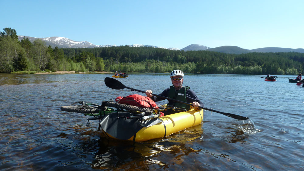 Stopping at a secluded spot on a tributary feeding into the loch, the afternoon’s lesson focused on reading the water so that we could learn to see where the safe spots were and what the hidden dangers and challenges to look out for were. Throughout, we all felt that we were learning new skills in a safe environment with Rob and Andy keeping us right and focused on the important basic skills we would need for paddling down the Spey the next day. However for me, the more I learned, the more I realised how different paddling is to biking. Bin it on a bike and most of the time you’ll be fine but on the water, there isn’t always the option to get off and walk when things start getting a bit beyond your comfort zone. After numerous attempts to read the water and getting to grips with working with the current to control our boats, we were soon heading down the stream into open water for a paddle to the café at the edge of Loch Morlich. Being Scotland on a warm day, the beach was akin to main beach scene in Jaws. It was absolutely jumping though thankfully without a malfunctioning mechanical shark to spoil our fun. Putting in on the beach, all of us felt like A list celebrities as folk came up to us asking what we were doing, why we had bikes on our boats, what they were like to paddle etc. If we had come out of the water in a white Lotus Esprit, I doubt we would have made a bigger impression. Like the Moneysupermarket.com legends that we now were, there was only one thing for it. Ice cold Cokes and Cornetto’s on the beach. Bliss! Not a bad way to end the first day.
