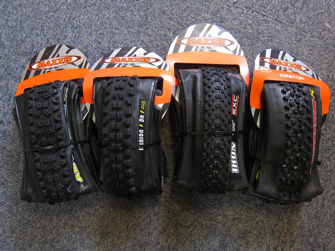A range of different 26ers and 29ers from Maxxis. Go with the Advantage for aggressive cross-country, the Ikon for a true light-weight tyre, the Minion for loose and muddy conditions or the Ignitor, which has several World Cup victories to its name.
