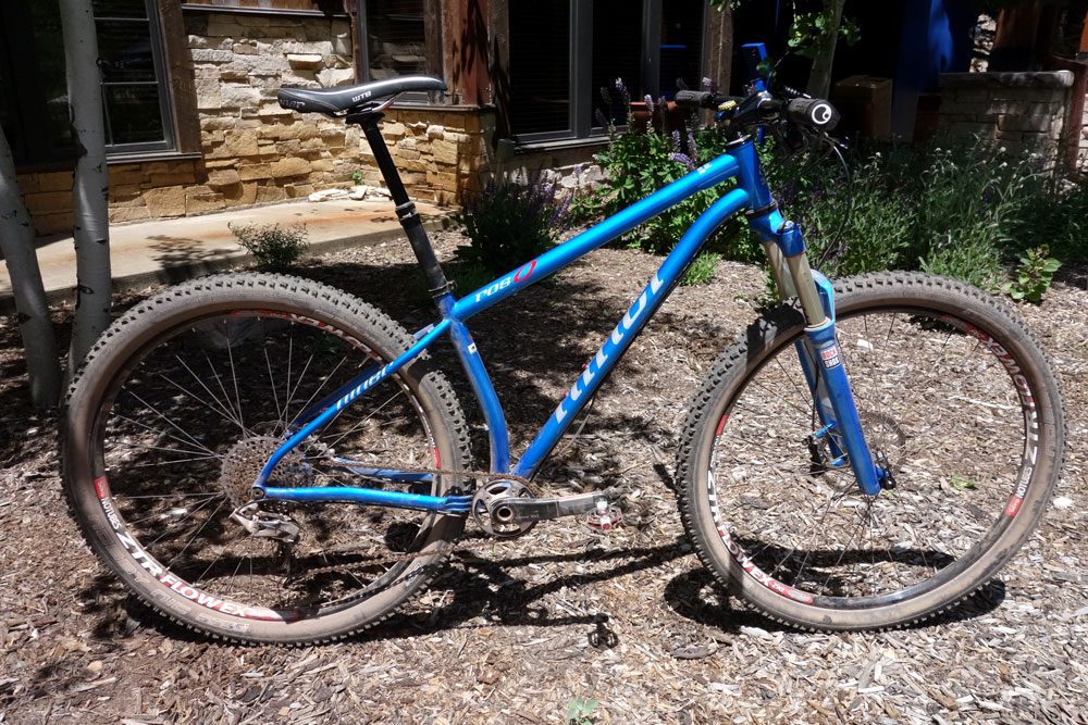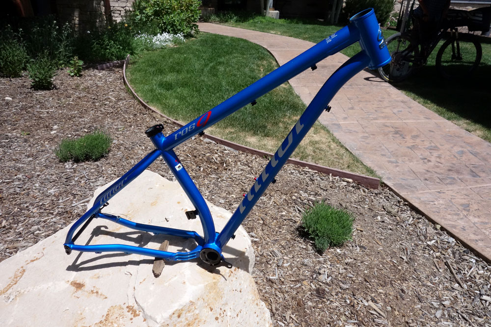 There’s a 44mm head tube with external lower cup and the ROS9 will work with a 120mm or 140mm 29er fork. With a 140mm fork, the head angle is 67°. Frame weight is around 6.1lbs. It’ll come in Rally Blue, seen here, or Forge Grey and should be out in September with a frame price of £799.