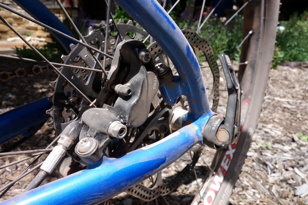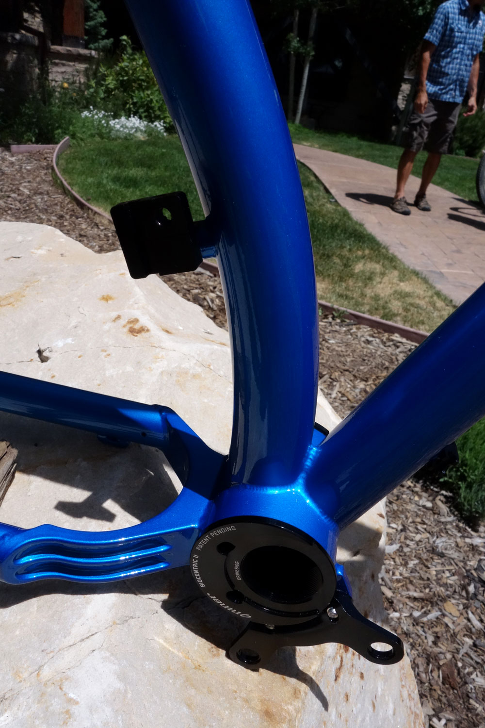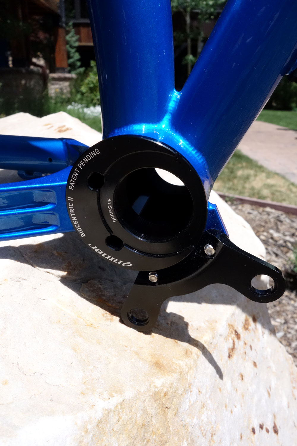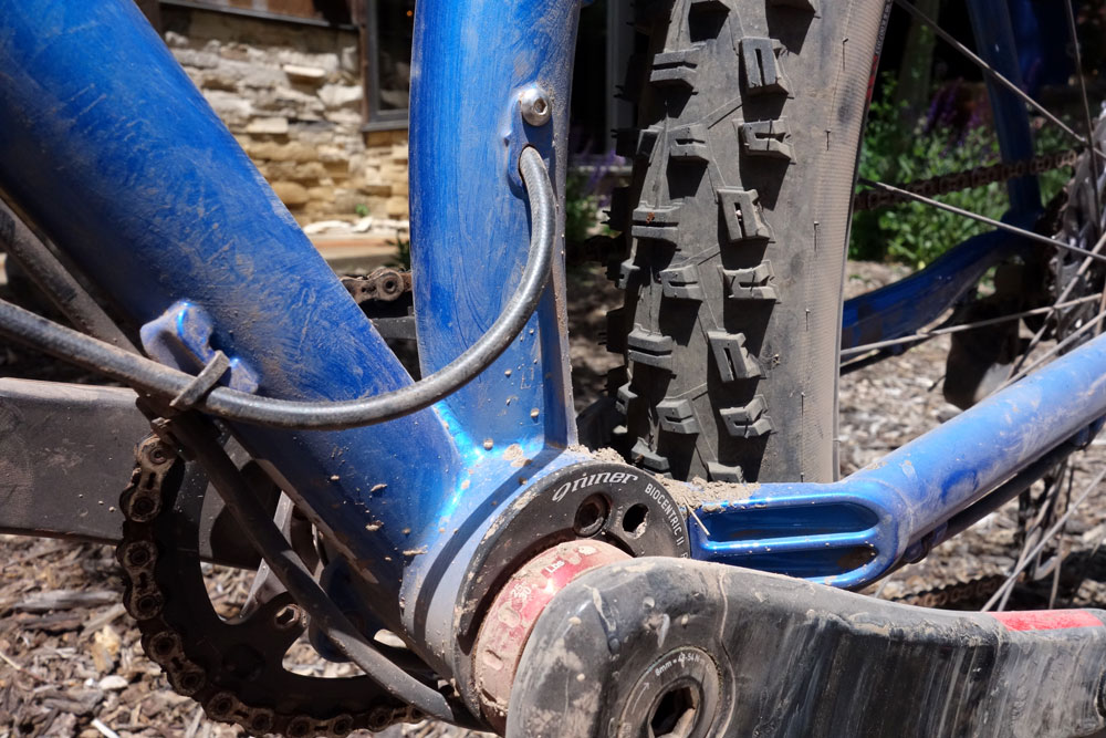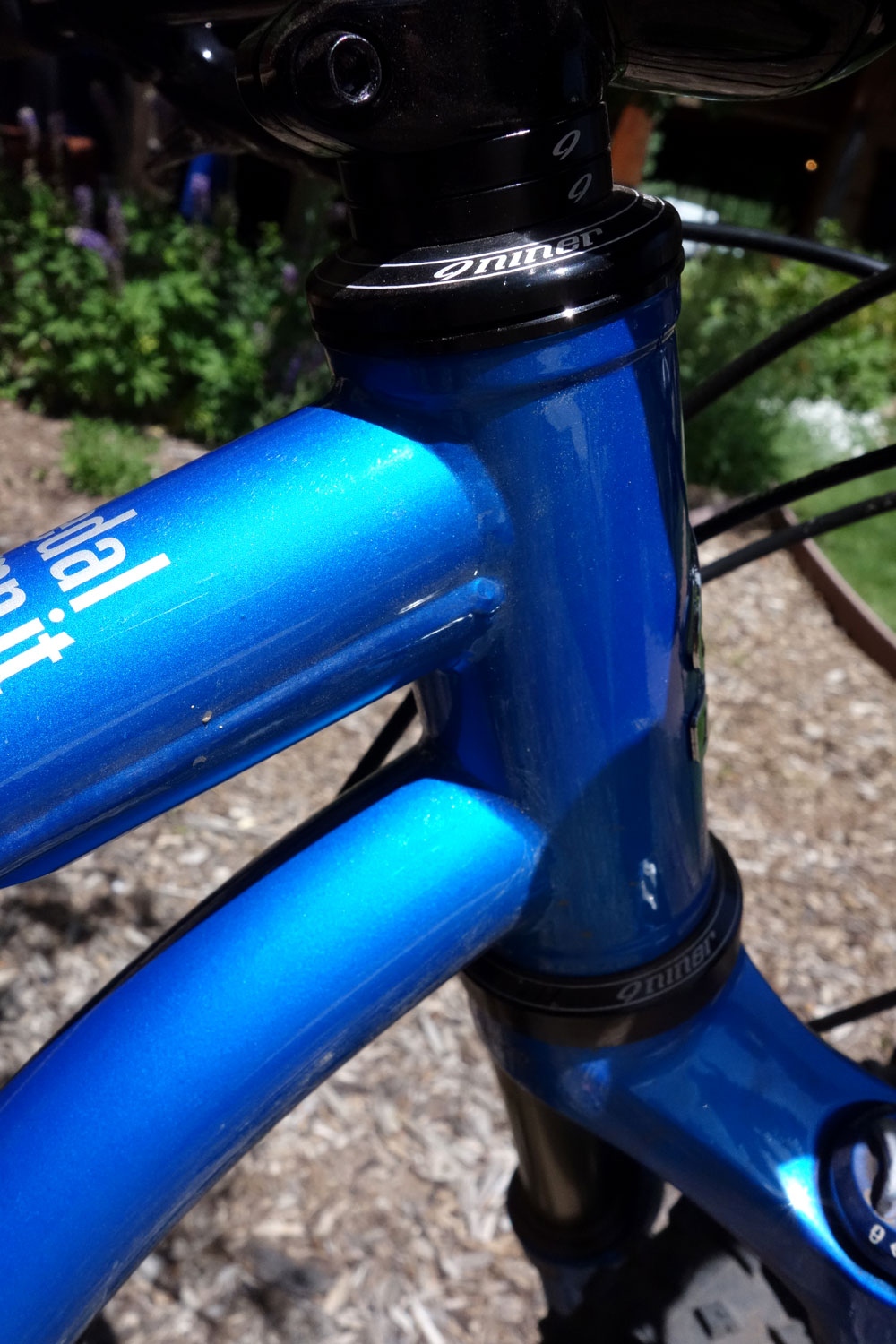 The frame also uses Niner’s Biocentric II eccentric bottom bracket which, along with neat hangerless bolt on dropouts allows for neat singlespeed operation. Even the direct mount front mech mount unbolts to clean the lines. The eccentric also allows even the geared bike to adjust chainstay length and BB height by up to half an inch. This, Niner reckons, really helps bring out the character of this long-legged play-bike. The effective chainstays can be brought in from 423mm to as short as 418mm
