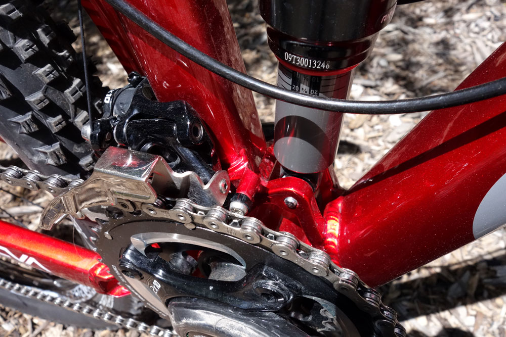 There are more burly appointments to the ROS9 too – including a bolt-on MRP bash guard (the eccentric BB shell precludes ISCG tabs to mount a chain guide to). There is a Stealth dropper post port, with a bolt-on blanking plate if you’re not running one and there’s a 142mm bolt-thru axle with those interchangeable dropouts for geared or not. Any and all of the cable guides are removeable if not needed.