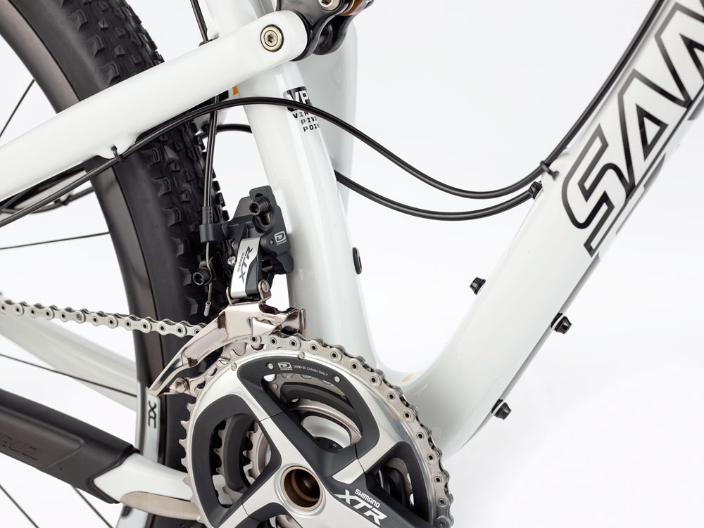 The weight of the Large carbon frame is 4.9lbs (in matt black) so the bike has lost a little over the previous model. It’s also gained some invisible structural improvements. Interestingly the carbon shock link is gone. The alloy link there now is lighter and way stronger, apparently. The frame now has a direct mount front mech and retains a 73mm threaded BB.