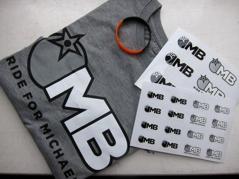 Here’s the most anticipated arrival at Singletrack Towers this week. The first of our (purchased) Ride For Michael tees. Michael Bonney is a great friend of the magazine and if you need any kind of motivation to go and ride your bike, then he is it. T-shirts are on sale now – and the stickers are cropping up all over the place (see Danny Macaskill’s helmet on his new video, or Simon Gallup of the Cure’s bass guitar from Lollapalooza.)