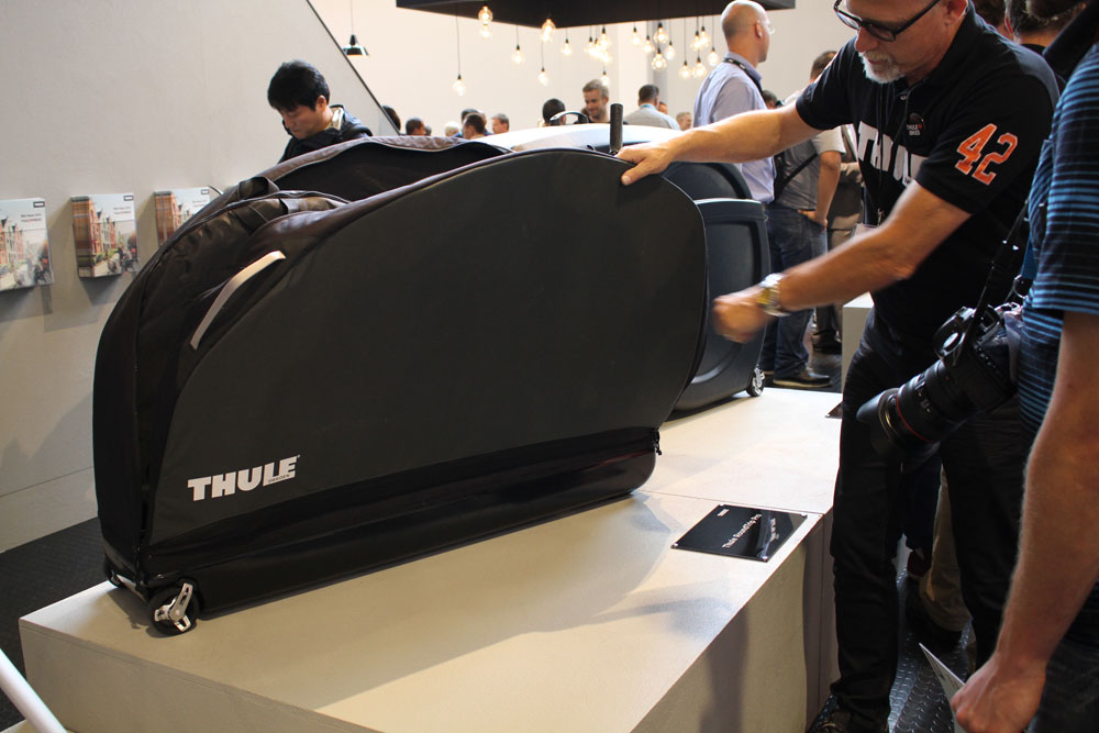 Thule had a buzzing stand – possibly due to hiring the services of the world’s third best barista to supply caffeine shots to all – but also there was a load to see. The biggest news is the new Roundtrip case range. The travel case melds two things that Thule does well: racks and roofboxes in a new way. There are two cases, the Pro and Elite; the Pro is a soft sided case and the Elite is a hard plastic case – both actually cost the same, so you make your own choice.