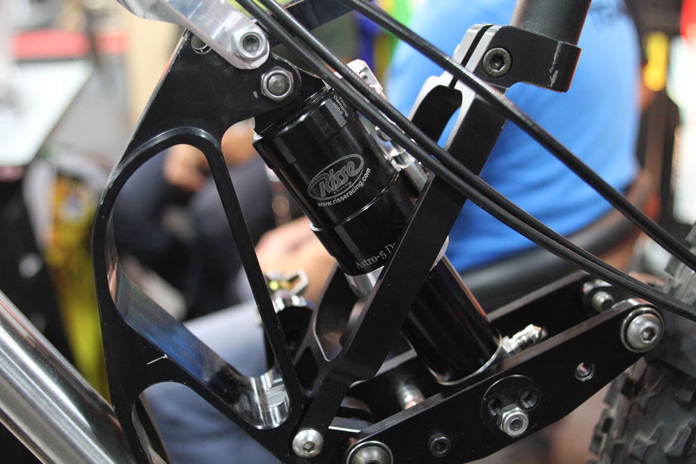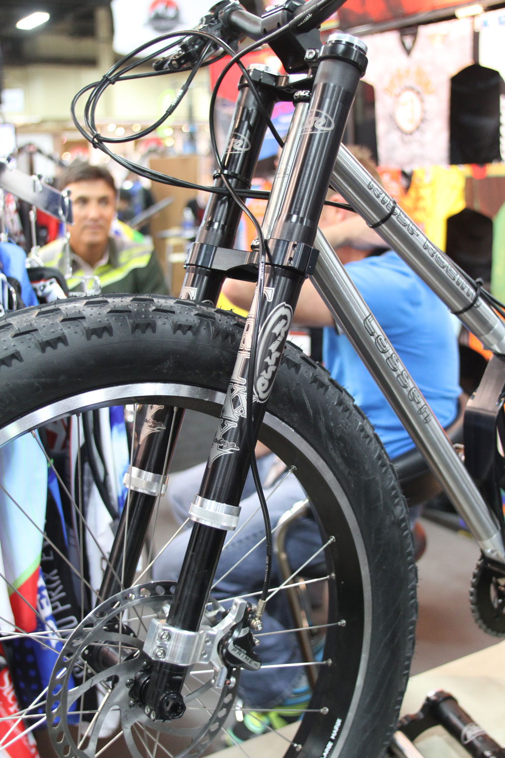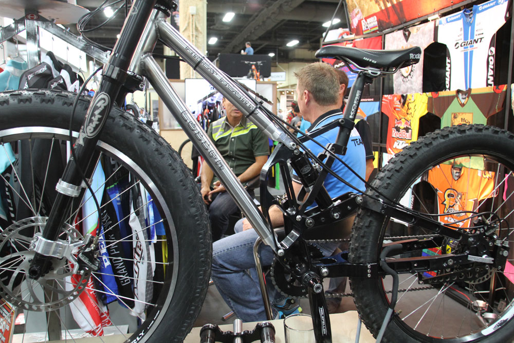 We thought we’d done fat bikes from Interbike, but we found some more photos that needed airing. This time it’s the full suspension semi-fat bike on the Risse booth. The rear tyre is a ‘mere’ 3in Nokian Gazzaloddi (remember them?). Risse is going fat forks as well as continuing to make custom rear shocks…