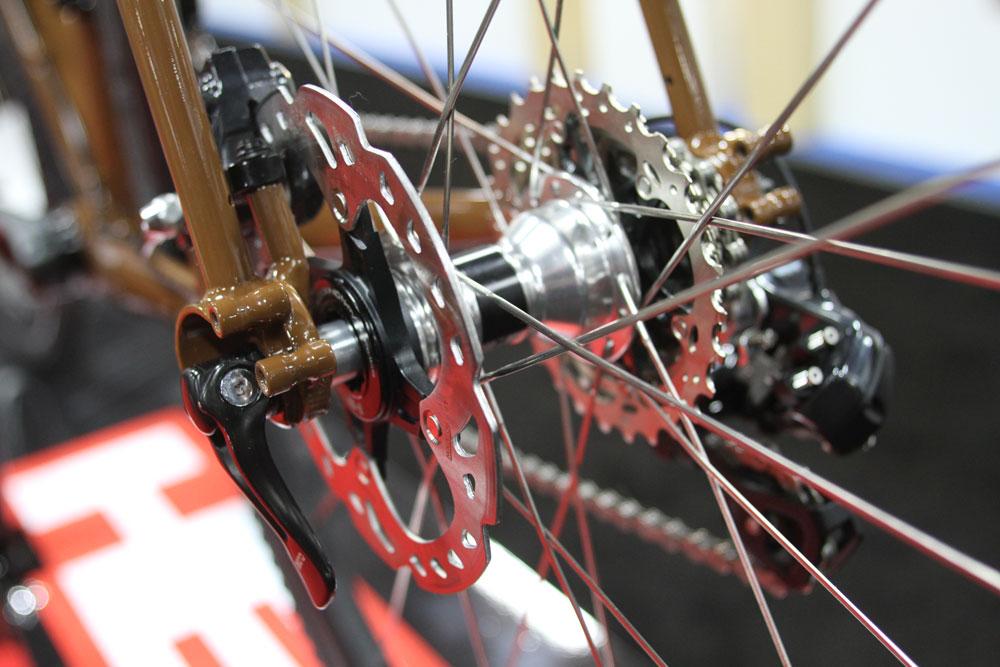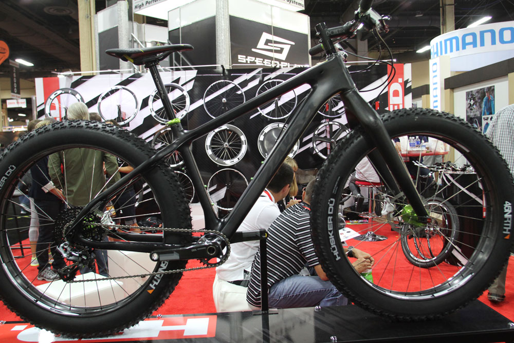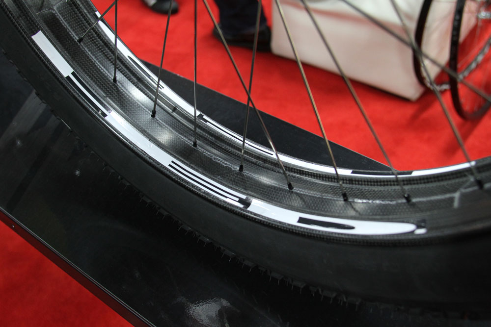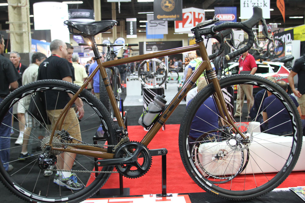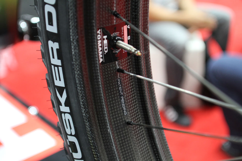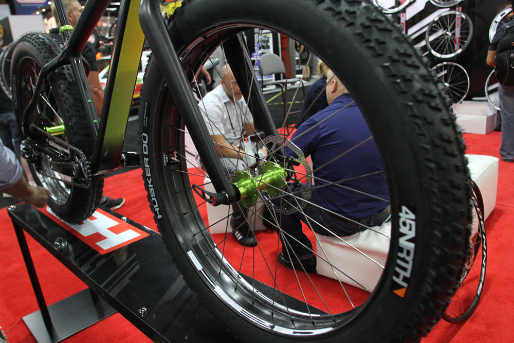 A glance at the HED booth, run by charismatic tinkerer Steve Hed showed up a few surprises. Among the fat aero wheels and triathlon stuff was a retro-looking tourer (somehow retro looking but with Di2 Ultegra discs), some 29er tubular rims and a 22lb Salsa Beargrease with carbon rims…