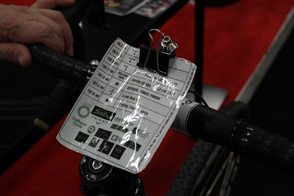 There was also a lovely looking chocolate brown touring/gravel racing bike that Steve Hed had built for himself, including some very personal touches. The bike features Maxle thru-axles front and rear, just because he can, as well as stealthily routed Shimano Ultegra Di2 hydraulic. As this is intended for the bike Midwest gravel road races, Steve has also incorporated a custom made bulldog clip mount and board for holding route-card cue sheets for easy reference.