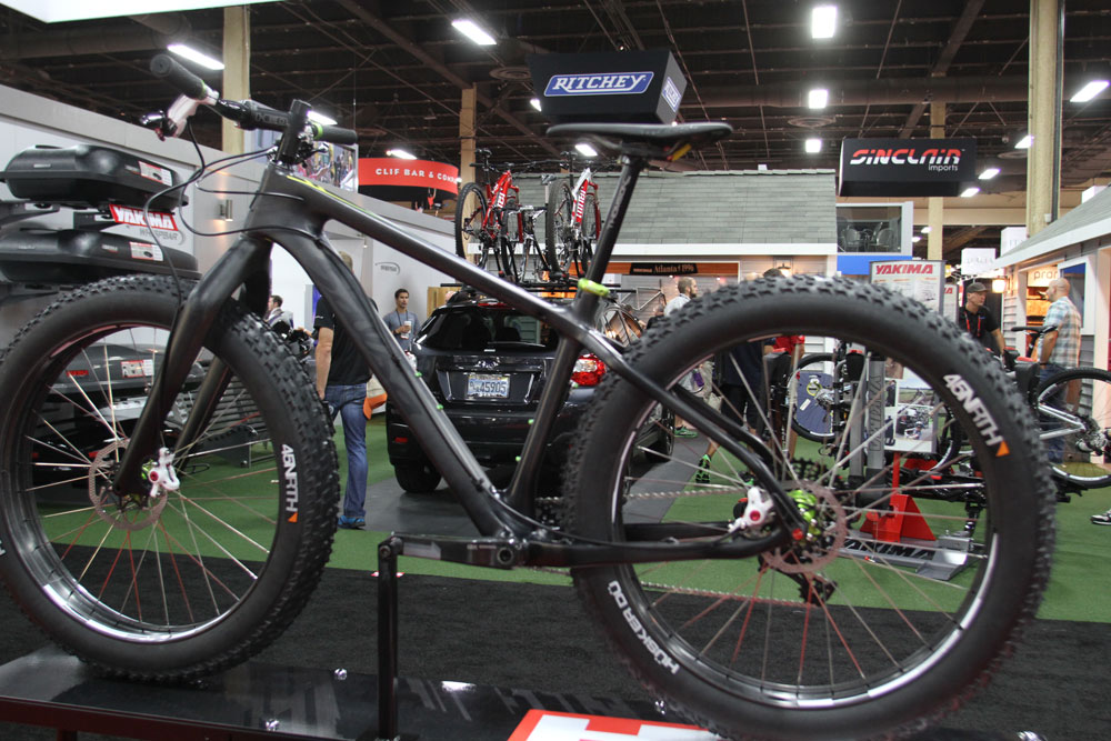 Let’s start with the fat bike. It seems that fat bike racers and trail riders like light bikes too, so Steve has been playing around with 85mm wide carbon rims that weigh 450g each. This helps bring the weight of a Salsa Beargrease in under 23lbs…