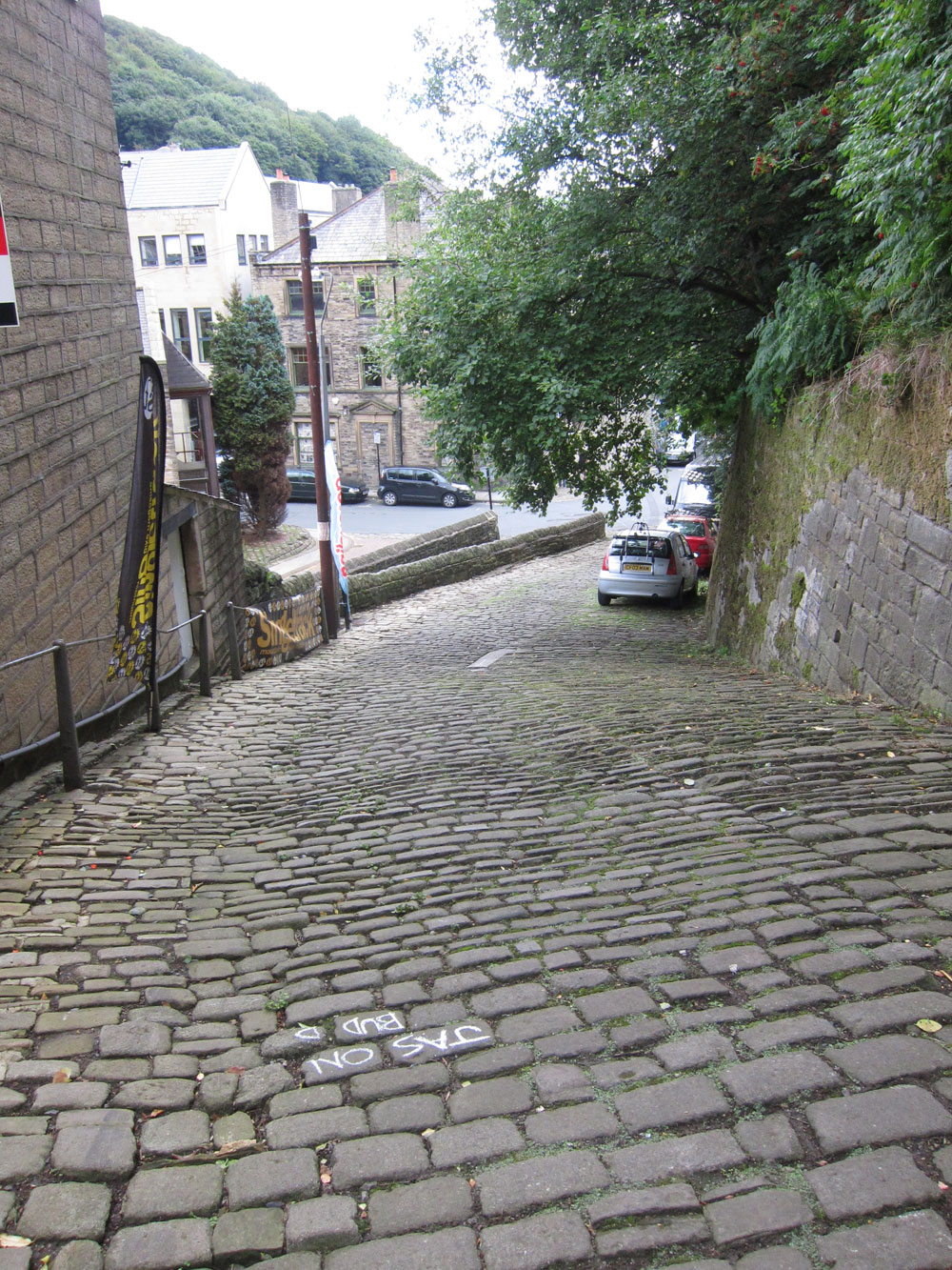 The Buttress used to be a way up the steep Calderdale hills from Hebden to the village of Heptonstall, high on the hilltop, but now this cobbled lane is only used occasionally by people wanting to take the short and painful way up the hill. Which was the case on Saturday.