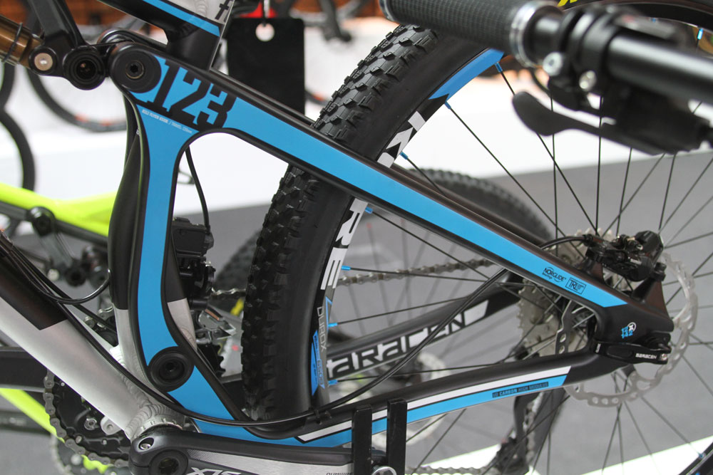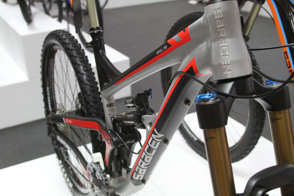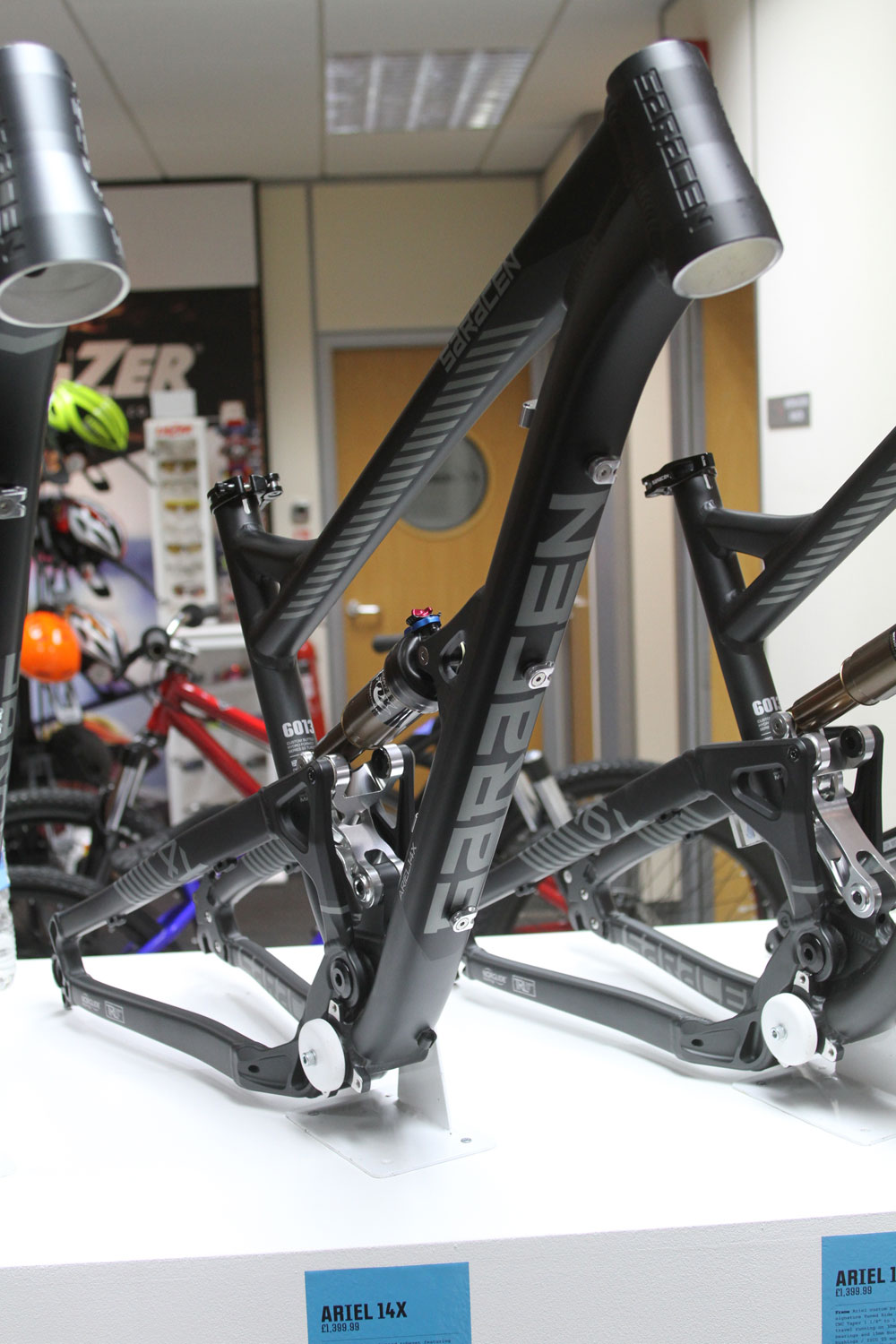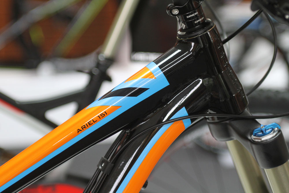 Now, let’s look to the Ariel. A bike that we’ve reviewed in the past and loved (Benji even went out and bought his own). The Ariel, too, goes to 27.5in for 2014, (though a 26in frame-only option is still available for next year). The Ariel 151 features, 150mm of travel and it gains a carbon fibre back end for 2014. Probably the jauntiest paintjob in the room too…