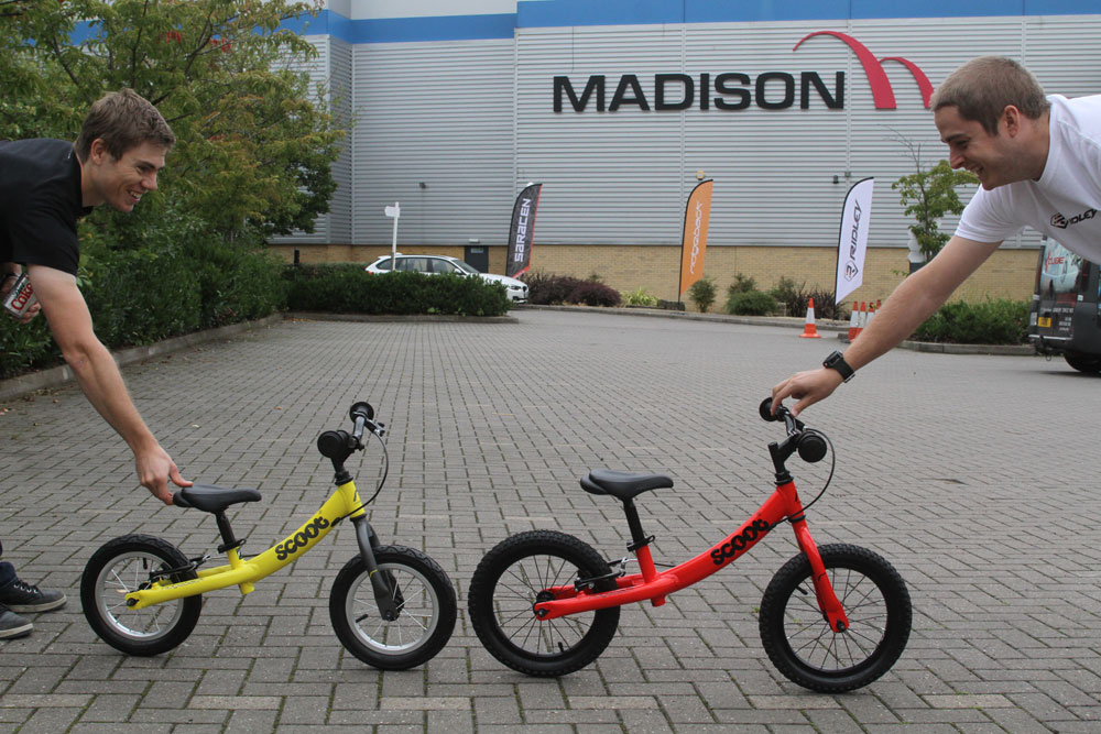 Meanwhile, in the car park itself, there was a battle brewing. It seems that even the scoot-along bike world isn’t immune to wheel-size arguments. There we saw Madison guys Oli and Chris arguing over whose bike was the best.