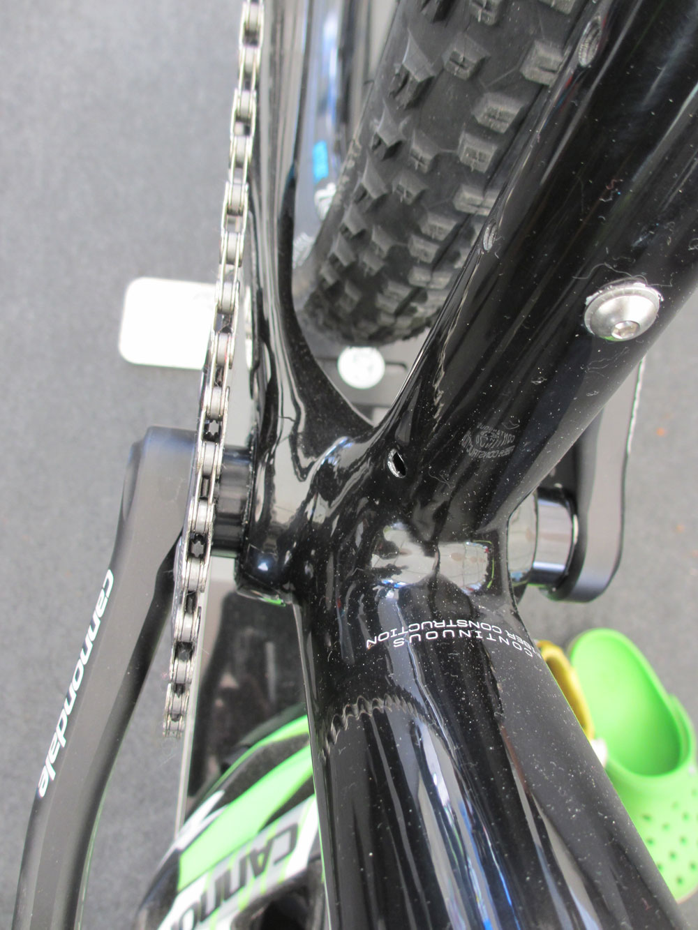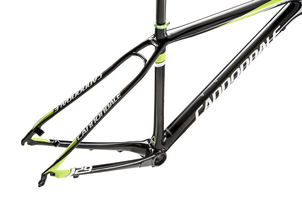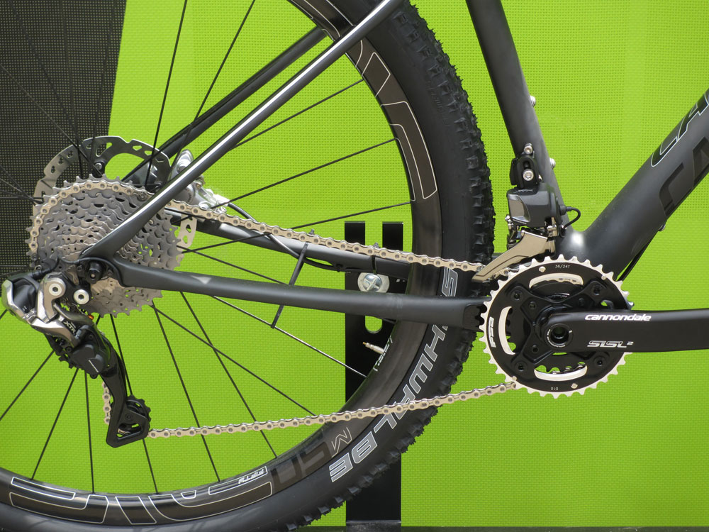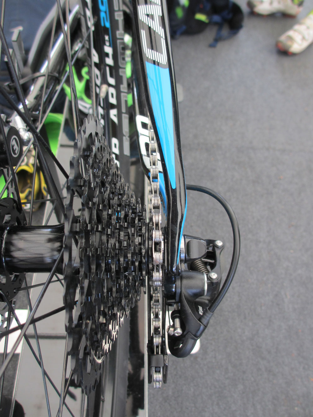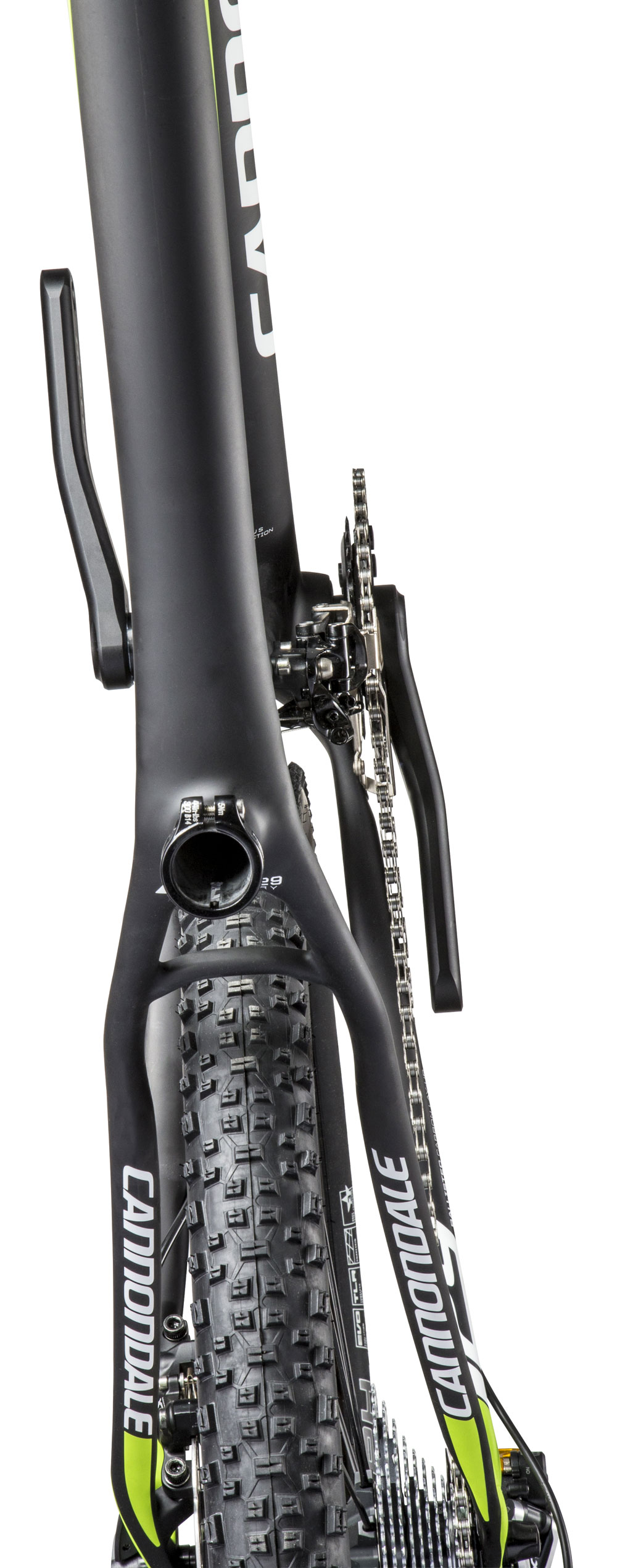 Pulling the back end in on a 29er often causes front mech/tyre clashes, odd angled seat tubes – or forcing the rider to run a one-by setup, which doesn’t suit all riders or courses. Cannondale has managed super short 429mm by moving the entire drivetrain 6mm further out from the bottom bracket centreline by using a special spider on its cranks. Normally this would be a chainline nightmare, but Cannondale has done the same with the rear end of the bike, kicking out the back end by a similar amount. It’s not a new way of doing things; Pace were doing it in the 90s, and many fat bikes use offset drive trains, but this is the most mainsteam interpretation we’ve seen so far. The bike still uses a standard QR rear hub and rims, but the wheel is built dishless, for strength and to keep the rear tyre in line with the front. The result is a bike with super short chainstays, a strong back wheel, and a lot of mud clearance. Even a mid-race, emergency swap to a regular, dished rear wheel should still clear the seat and chain stays.