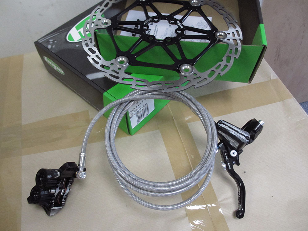 Chipps has been busy upgrading the stoppers on his tandem. The Tech 3 V4 brakes from Hope are aimed at gravity riders so should do the job nicely at stopping a tandem. See the brakes in action this weekend at the Bristol Bikefest on Sunday, under Guy Martin and Terrahawk.