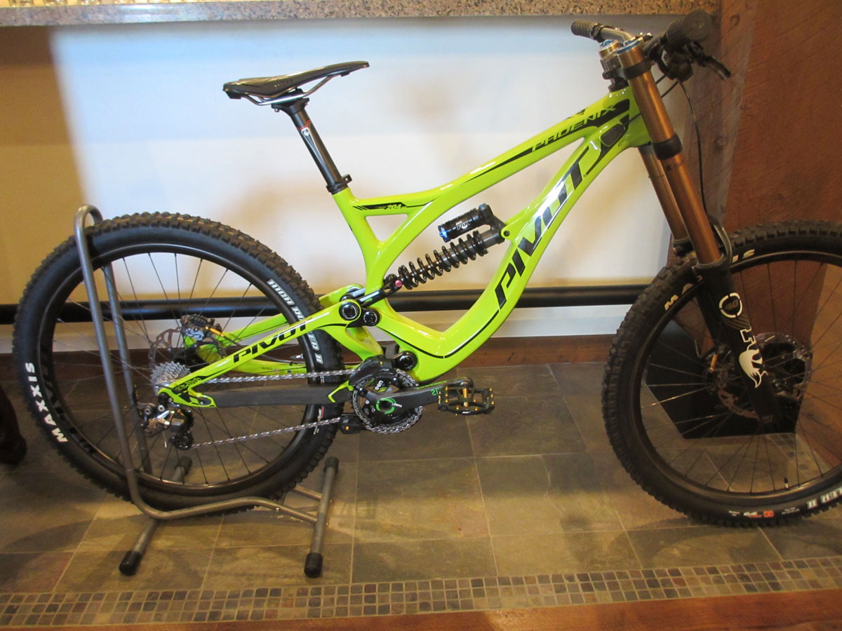 Moving across the room, we get a glimpse at Pivot’s Phoenix carbon DH bike. It’s being raced on the World Cup circuit under Bernard Kerr and the Pivot DH team. They’re running prototype Reynolds carbon wheels and the bikes are coming in around the mid-30lbs. This particular bike has SRAM’s XO1 DH groupset, an air shock and a few light bits and pieces, but still dual ply tyres (more of them in a minute) and nothing too mad – and it comes in at 30.8lbs. Not bad for a downhill bike…