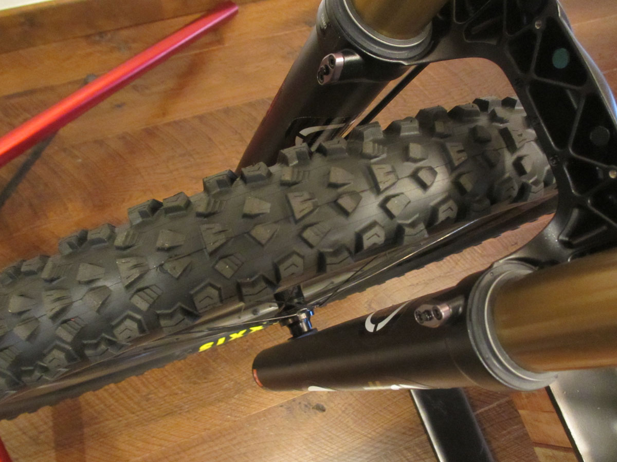 Fitted to the Phoenix we spy a low profile Maxxis downhill tyre. Coming to a World Cup race course near you.