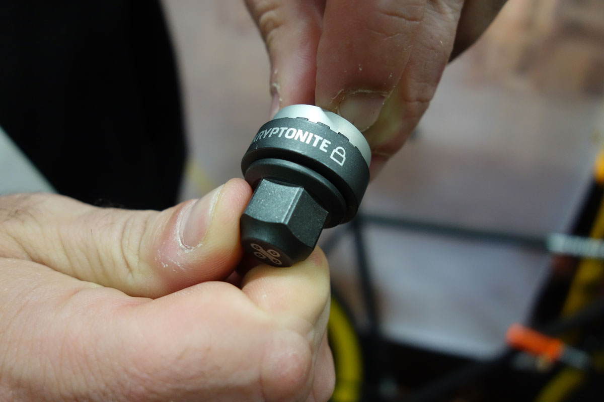 Locking wheel nuts – this wins our ‘That’s simple, yet clever’ award. These locking wheelnuts are intended to secure your front wheel (ignore the fact they’re on a rear wheel in the pics, though they work there too) and they’ll do up with a regular 15mm spanner, then just loosen them 1/8th of a turn and they’re ready to lock. A pin drops via gravity to prevent the nuts being undone. All you need to do it turn your bike upsidedown and the nuts will turn again, but in theory, if you’re bike is locked up at the rear, a thief can’t upend your bike. Simple, but clever, see?