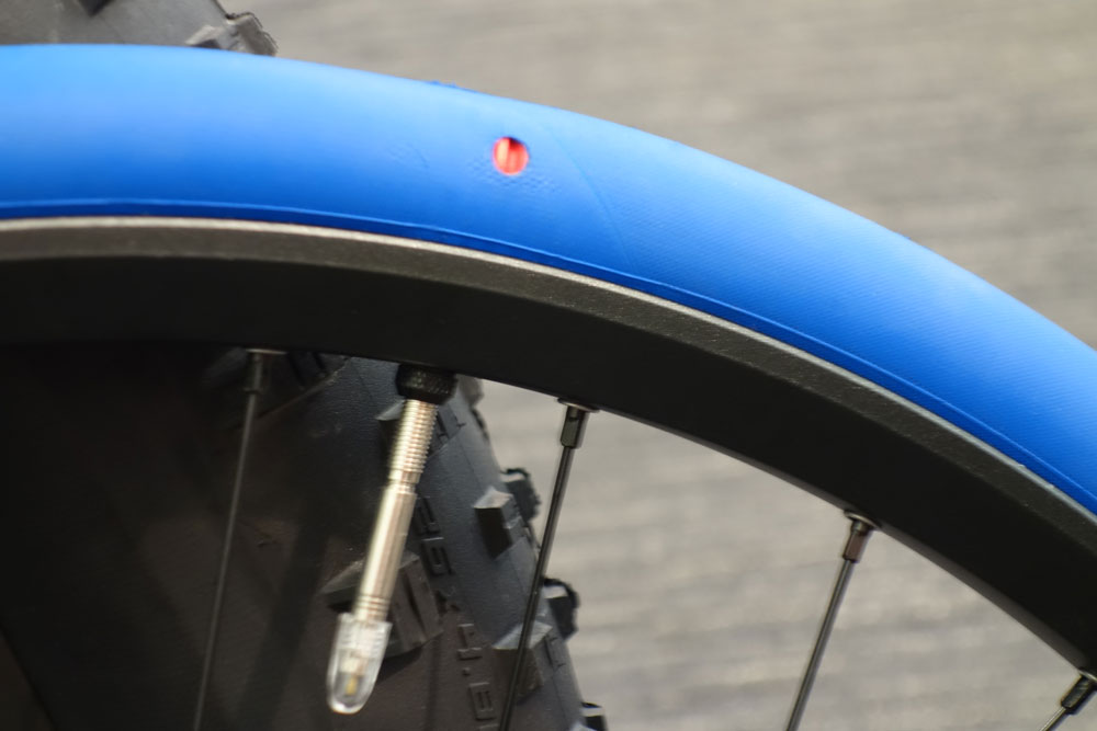 The clever/difficult bit has been in working out how to pump up the tyre. Initial prototypes showed two valve stems, but who wants to drill holes in their rims? The new version runs a new valve that will pump up the inner tyre/tube and then, with a couple of twists start inflating the outer tyre through that hole in the blue inner tyre. We look forward to getting our heads round this this spring.