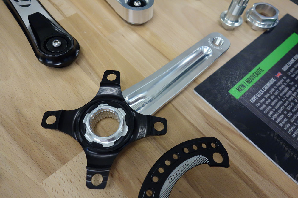 Looking back, even to Eurobike 2014, where Hope last showed its cranks to us it’s clear to see that the axle system (which was shown as a polygonal/triangular interface) has been replaced by a much simpler 30mm round axle and splined interface. here you can see the removable spider and the lock ring. The tool is included too.