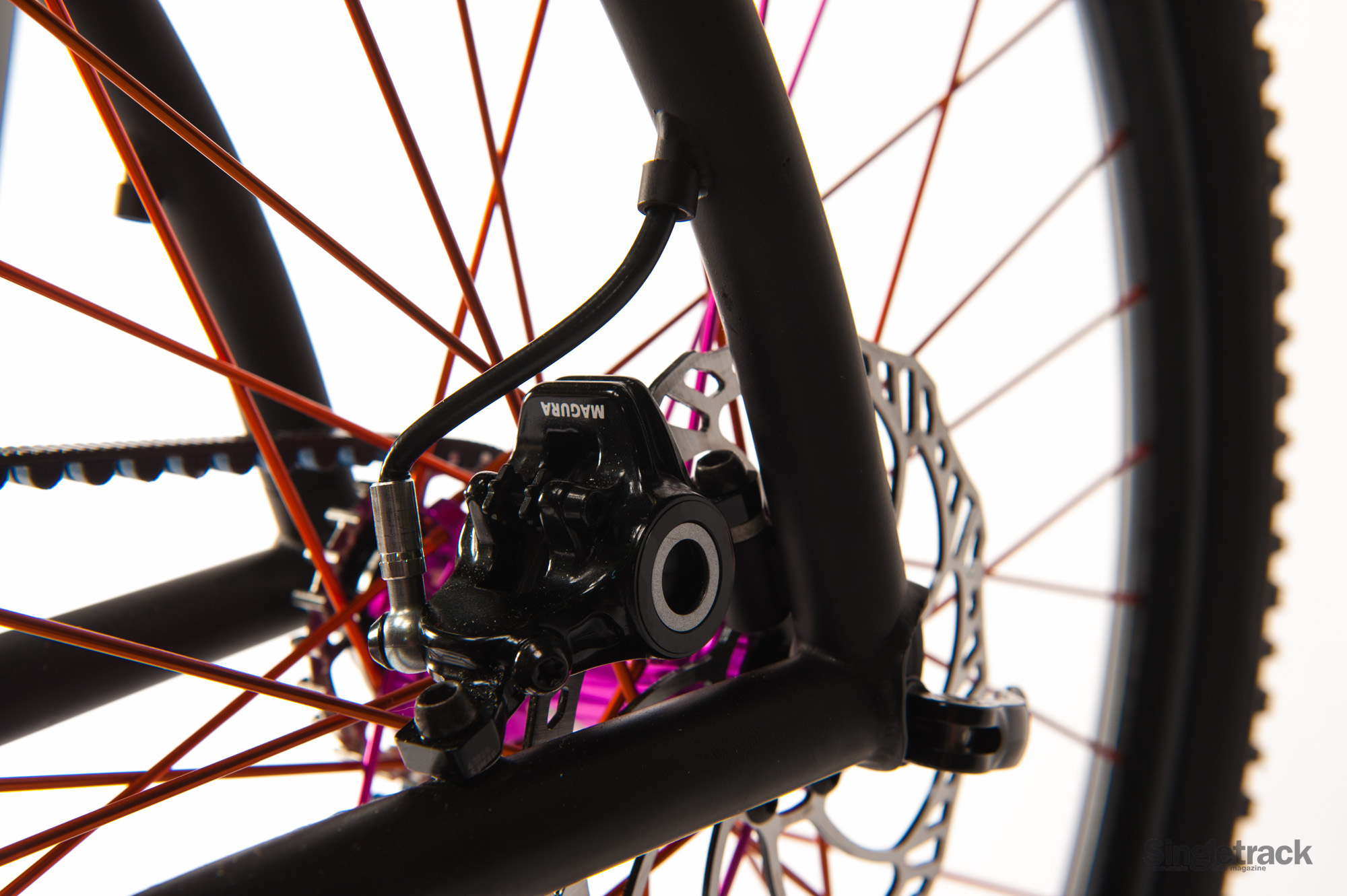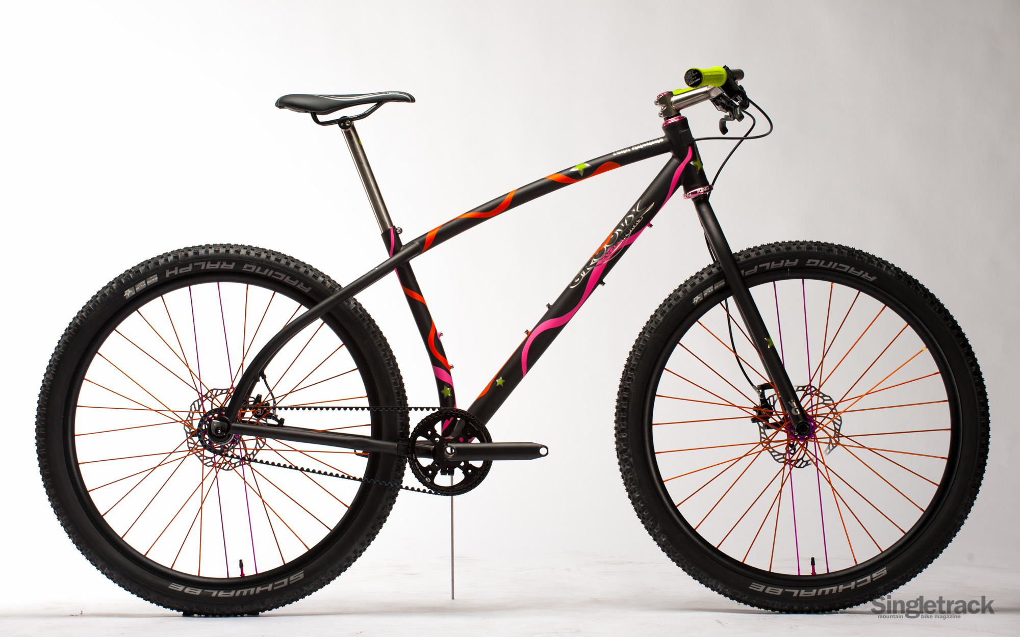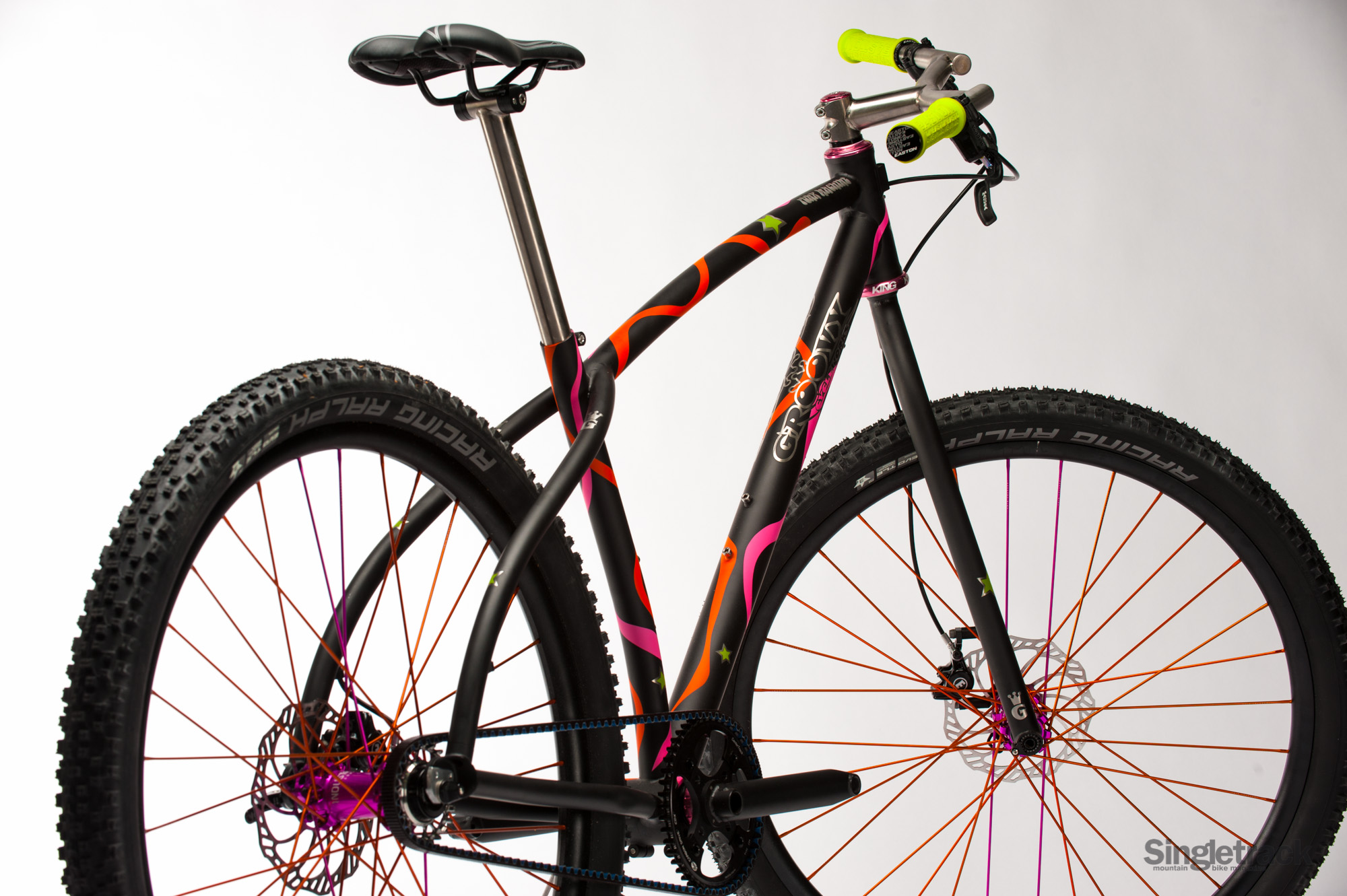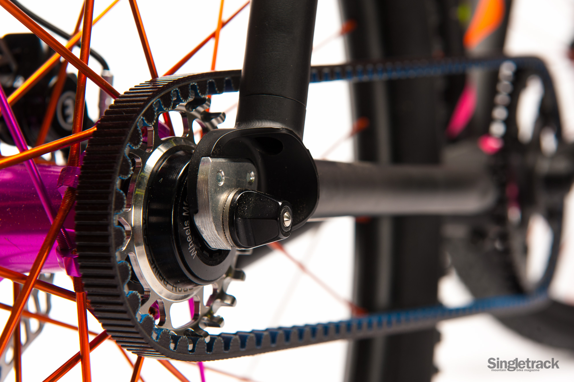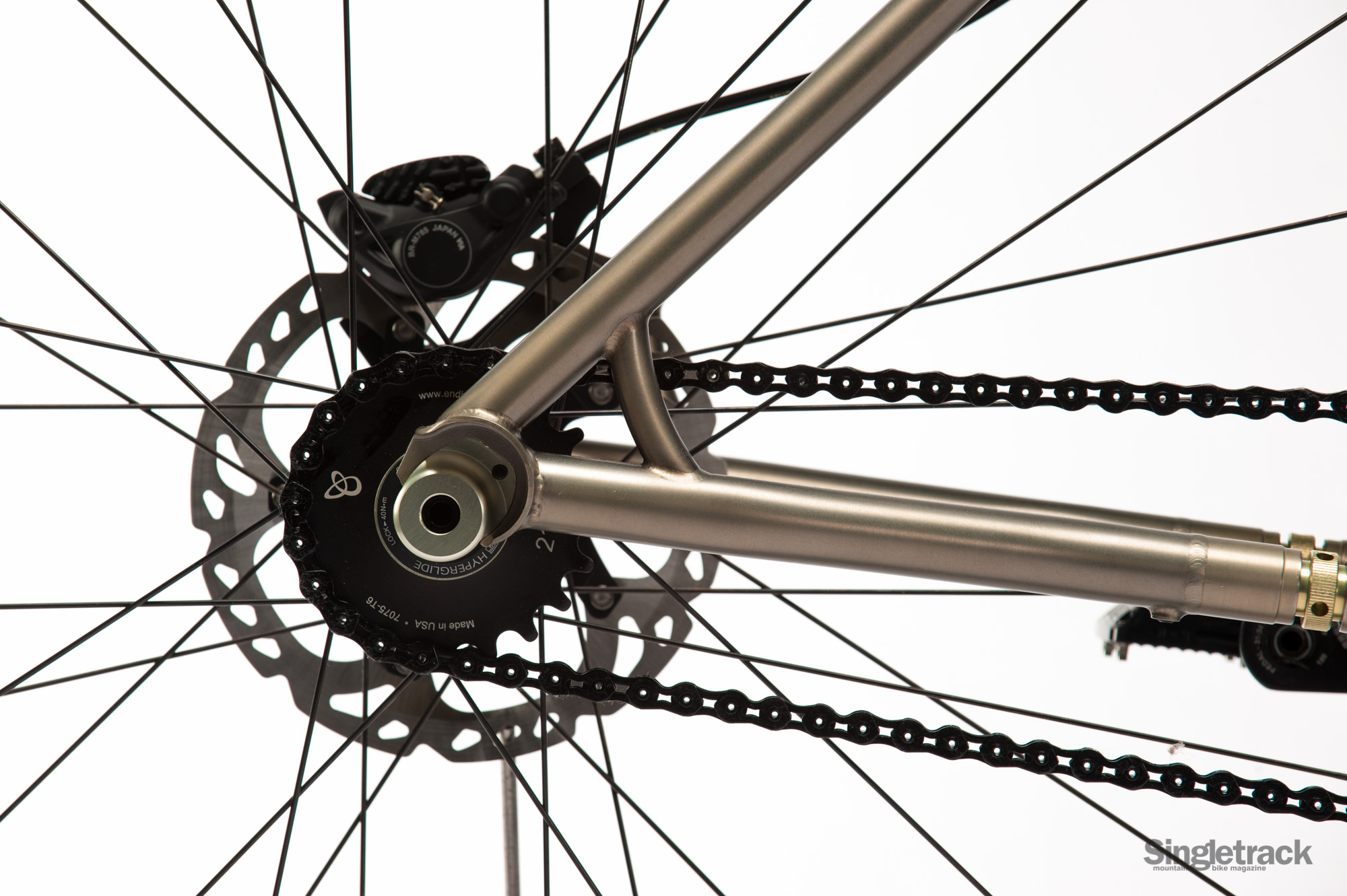 Groovy Cycleworks proprietor and builder Rody Walter has been at it since the early ’90s, learning at the legendary East Coast USA mountain bike maker Grove Innovations. This particular low-maintenance singlespeed was made for his 16-year old daughter to race on in the local race circuit. The frame, fork and Groovy bars are all titanium, and with the help of lightweight components throughout it adds up to a complete bike at just around 17 pounds. Note the hidden belt drive connection inside of the seatstay.