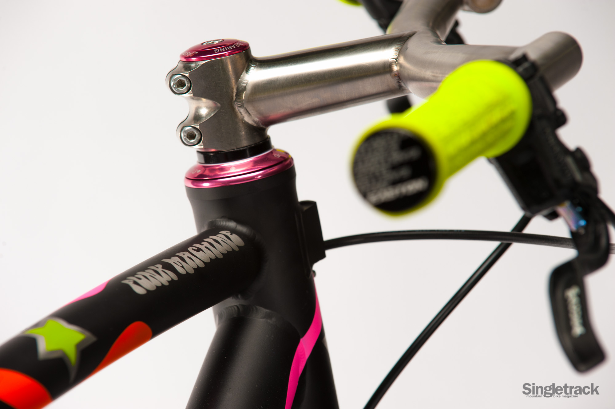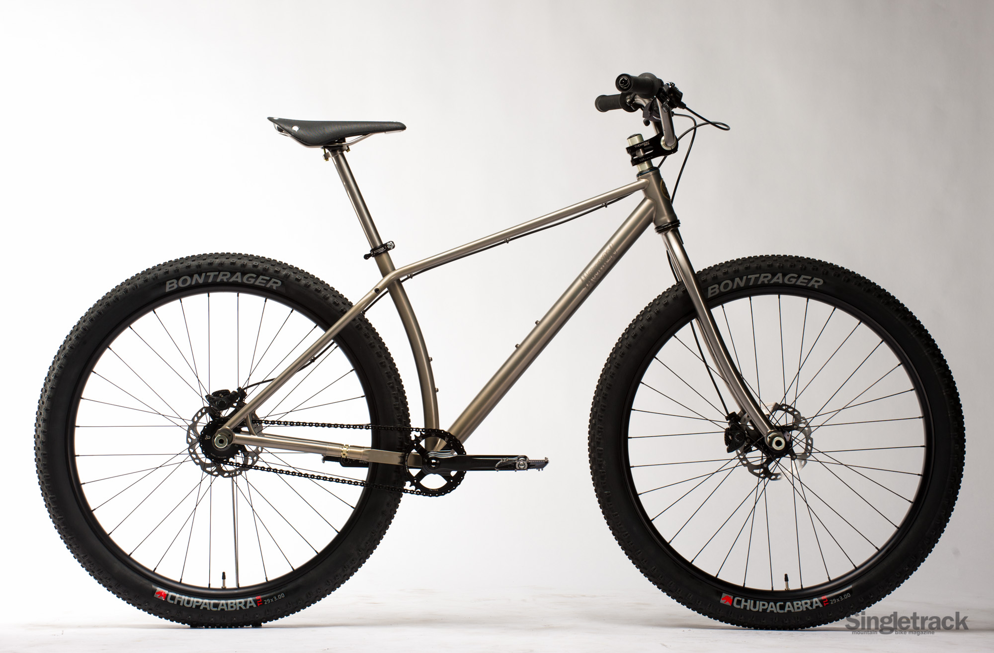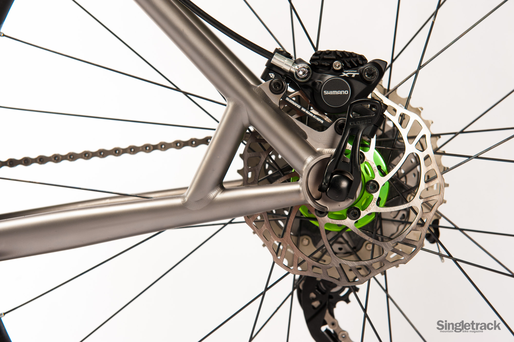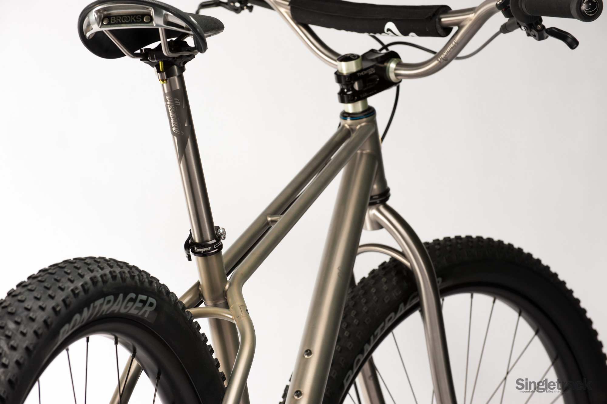 Quiring Cycles has adopted the 29+ wheel size wholeheartedly, and brought this titanium singletrack crusher to NAHBS 2015. The 29+ wheels excel in the undulating, uneven terrain that Quiring Cycles calls home, and between tyre volume and titanium construction provide traction and comfort akin to some short travel suspension designs. Note the custom chainstay yoke and weld quality on the detail images.