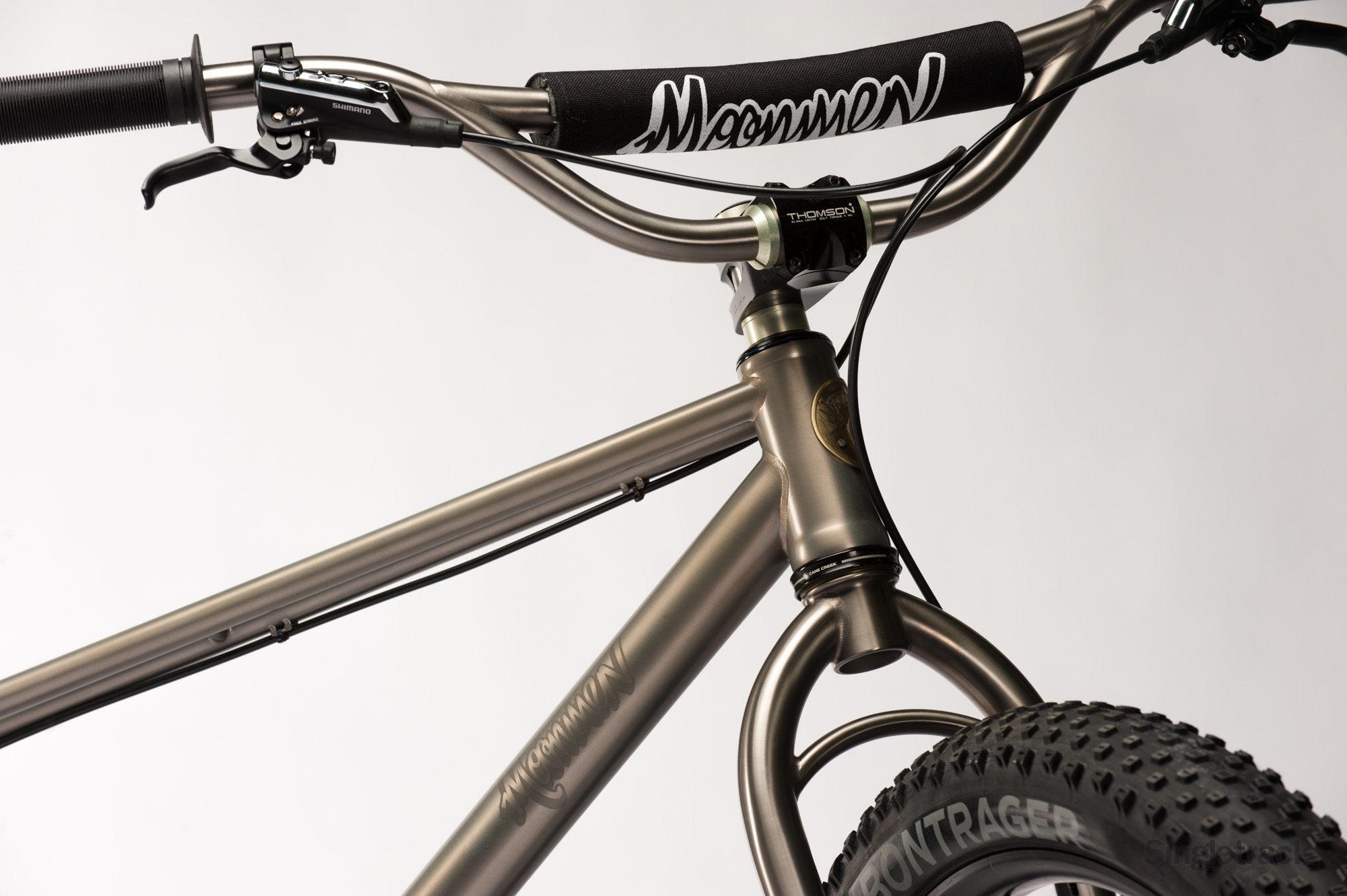 The back corner booth of Moonmen Bikes had some gems, including this 29+ titanium single speed. This bike begs to be thrashed; it was quite the effort resisting ripping around the back of NAHBS on this to and from the photo booth. While the thru-axle frame and Ti fork would be worth notice alone, the chain tension and travel system integrated into the rear triangle is a thing of beauty. Threaded inserts in the chainstay allow chain tension adjustment through the flex of the seatstay – enough for about two links of chain for any gear ratio to work. Keyed joints on both sides of the seatstay, coupled with the threaded chainstay inserts, allow the entire rear end of the bicycle to break down for easy air travel — packing should be easier than with traditional couplers thanks to the total lack of rear triangle once disassembled.