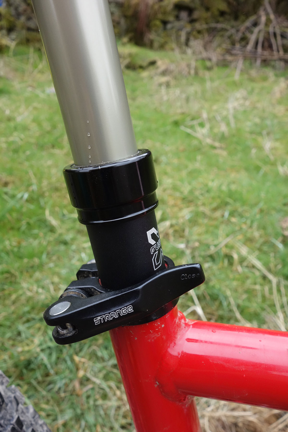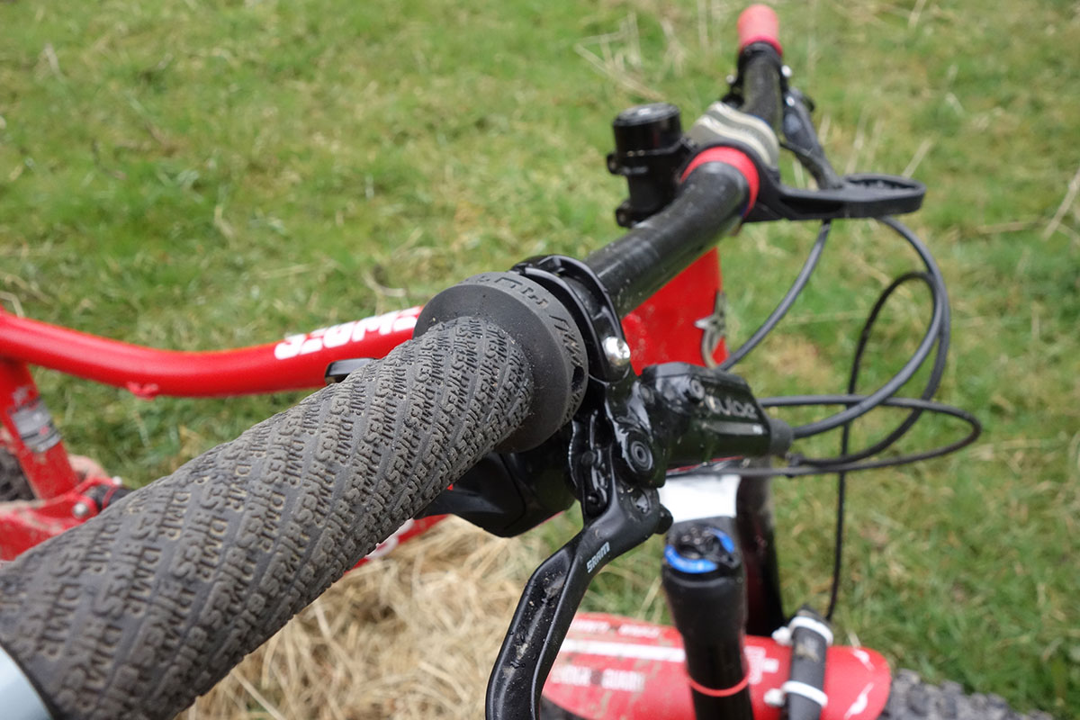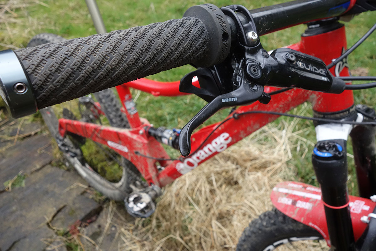 Running two different grips? How do you think grip grouptests get written? You can just see the tiny Renthal Apex stem that is of the recommended 35mm length. Orange has lengthened the top tube over the original Gyro to allow for a shorter stem.
