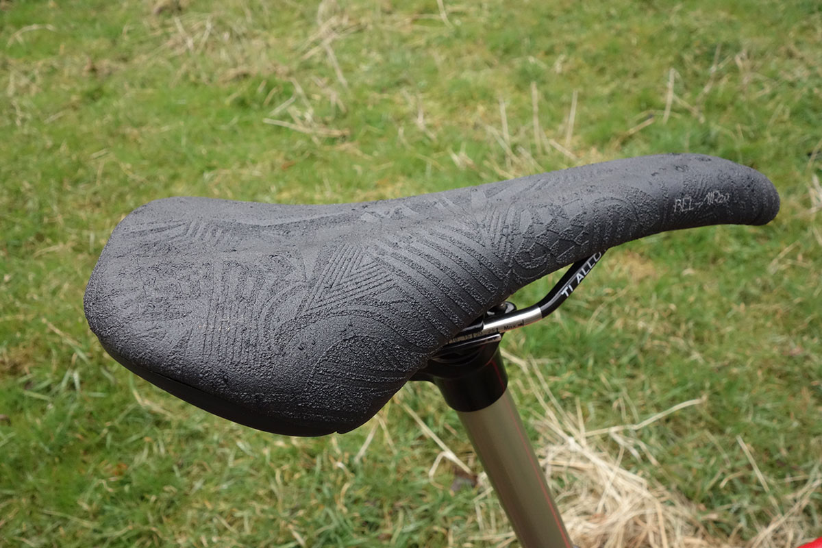 The X-Fusion Hi-Lo post is now fitted, with plenty of room for the lever to run under the left hand side of the bars for thumb actuation. Atop the Hi-Lo is a new SDG Bel-Air with a very grippy, embossed pattern seared into the cover, adding a good bit of grip when wet. Here it is before getting muddy.