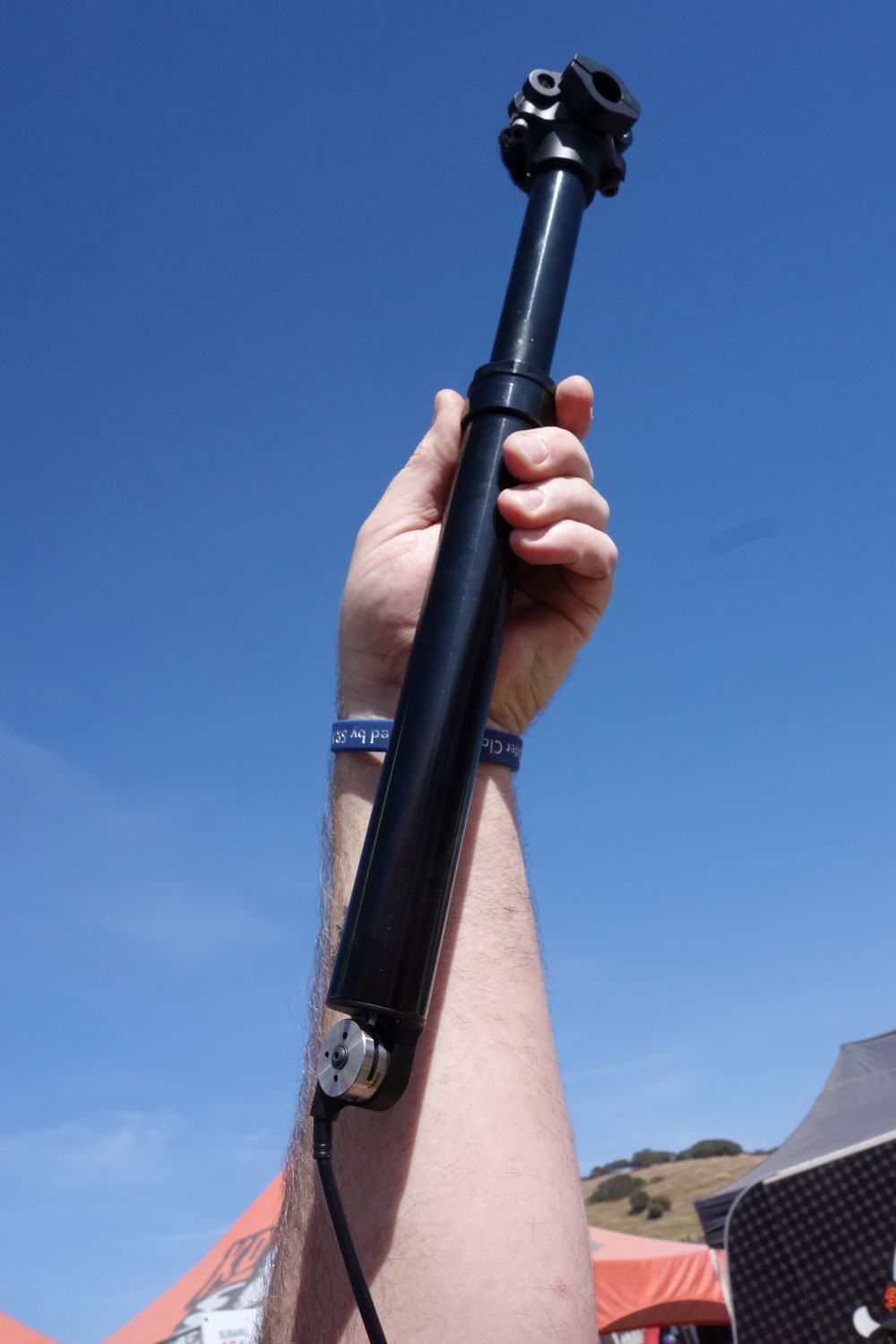 RST also showed its new-ish dropper post that offers external cable operation, Stealth routing or ‘crotch grab’ under-seat lever – all in the same seatpost, which we’ve not seen anyone else do. So if you don’t currently have a Stealth routing frame and fancy a dropper without drilling a hole, you can fit the RST post and still be able to swap it over to your new frame.