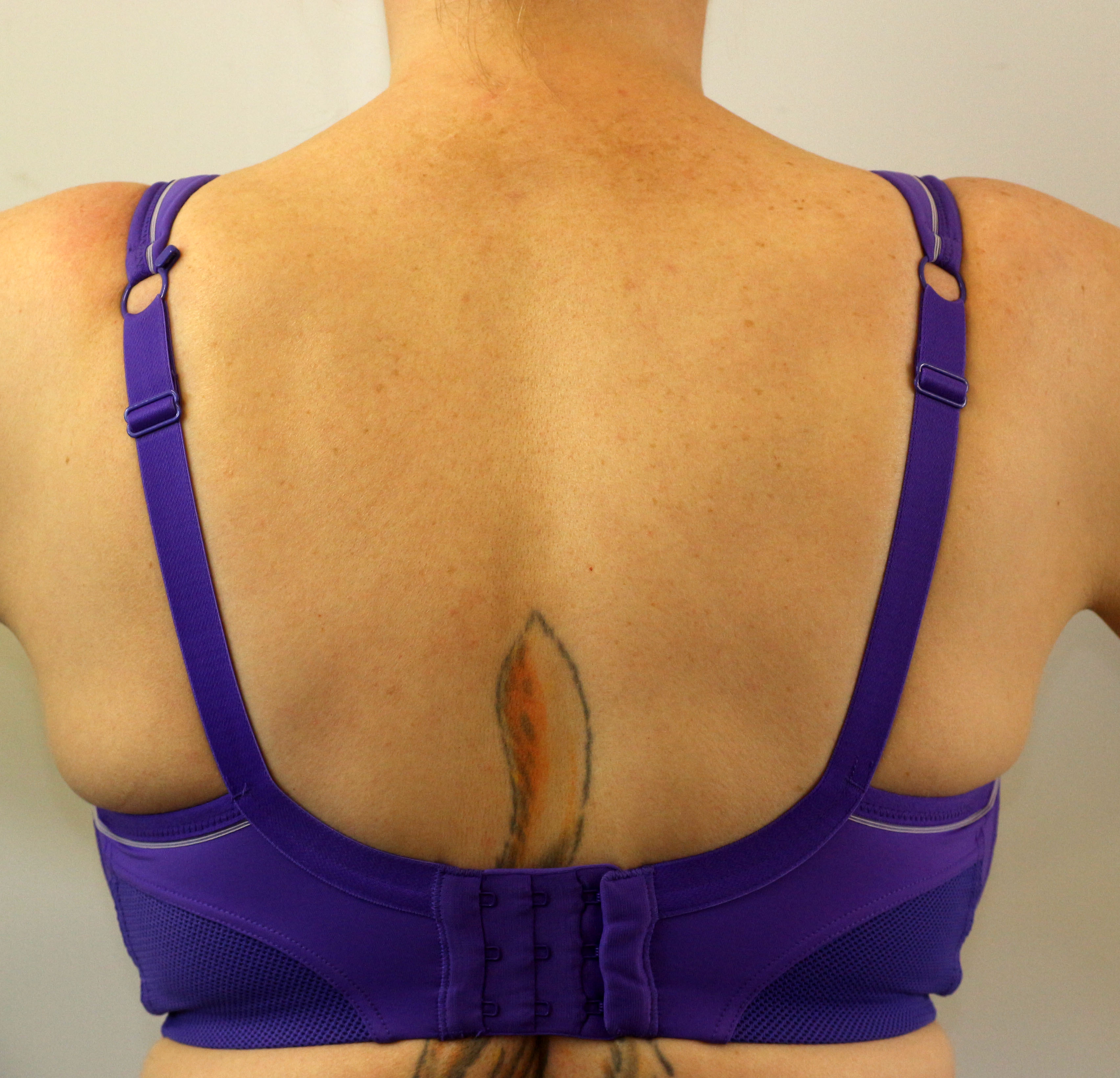 It doesn’t have the uplift and shape of some of the others, and doesn’t sit flush to the sternum between the boobs; however they do sit apart. Slightly more pressure is taken by the shoulder straps and these are beautifully designed; wide and soft where the support is needed most, pared down elsewhere. It’s a quite low cut at the front so I had slight overspill but this didn’t affect the bounce control, which was very good. The band underneath is wide and flat and rolled up when I bent forwards; it didn’t dig in but I was aware of it.